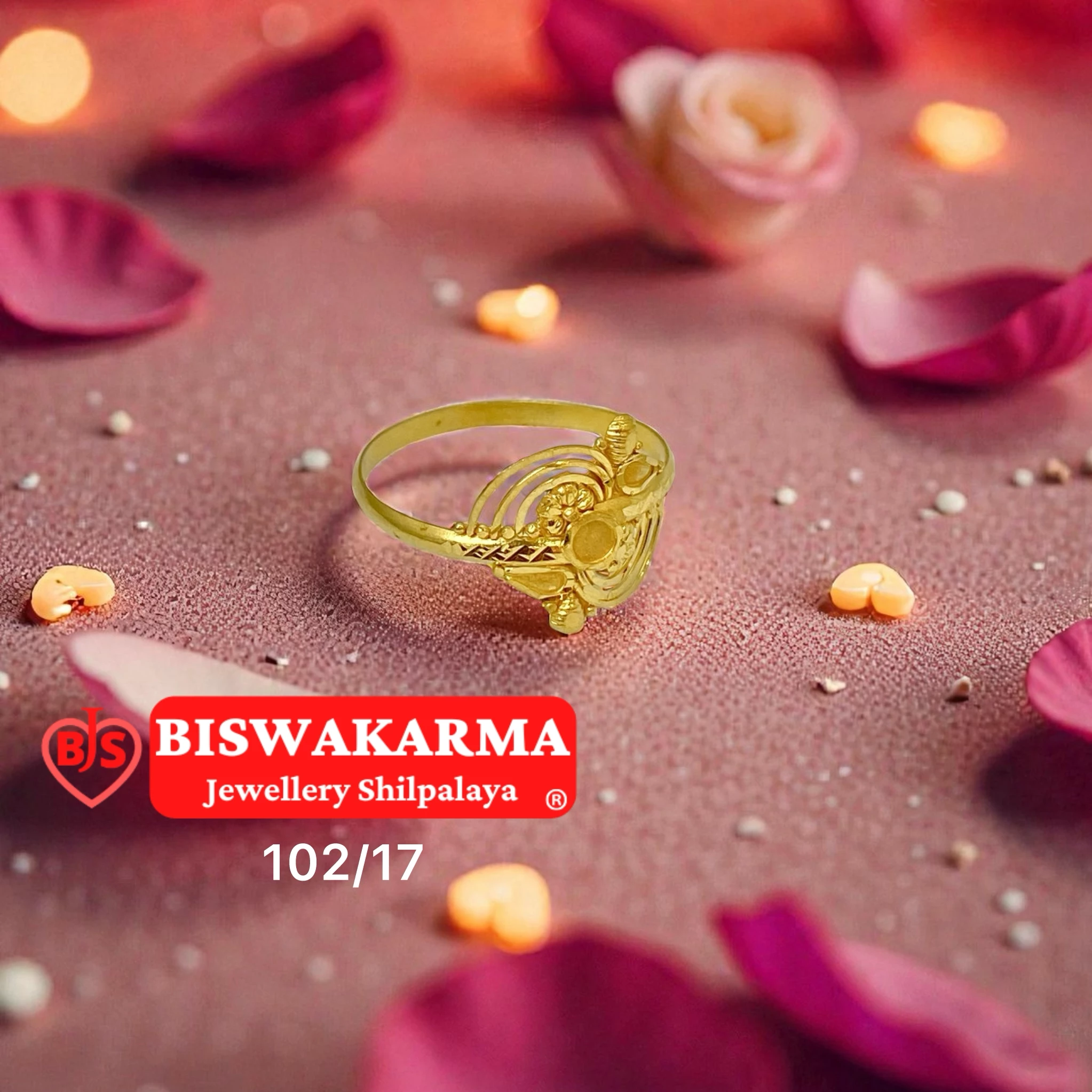 Graceful gold ladies ring featuring layered curved lines and a soft circular focal form. Fine openwork detailing gives it a light, flowing look with a smooth, polished finish.