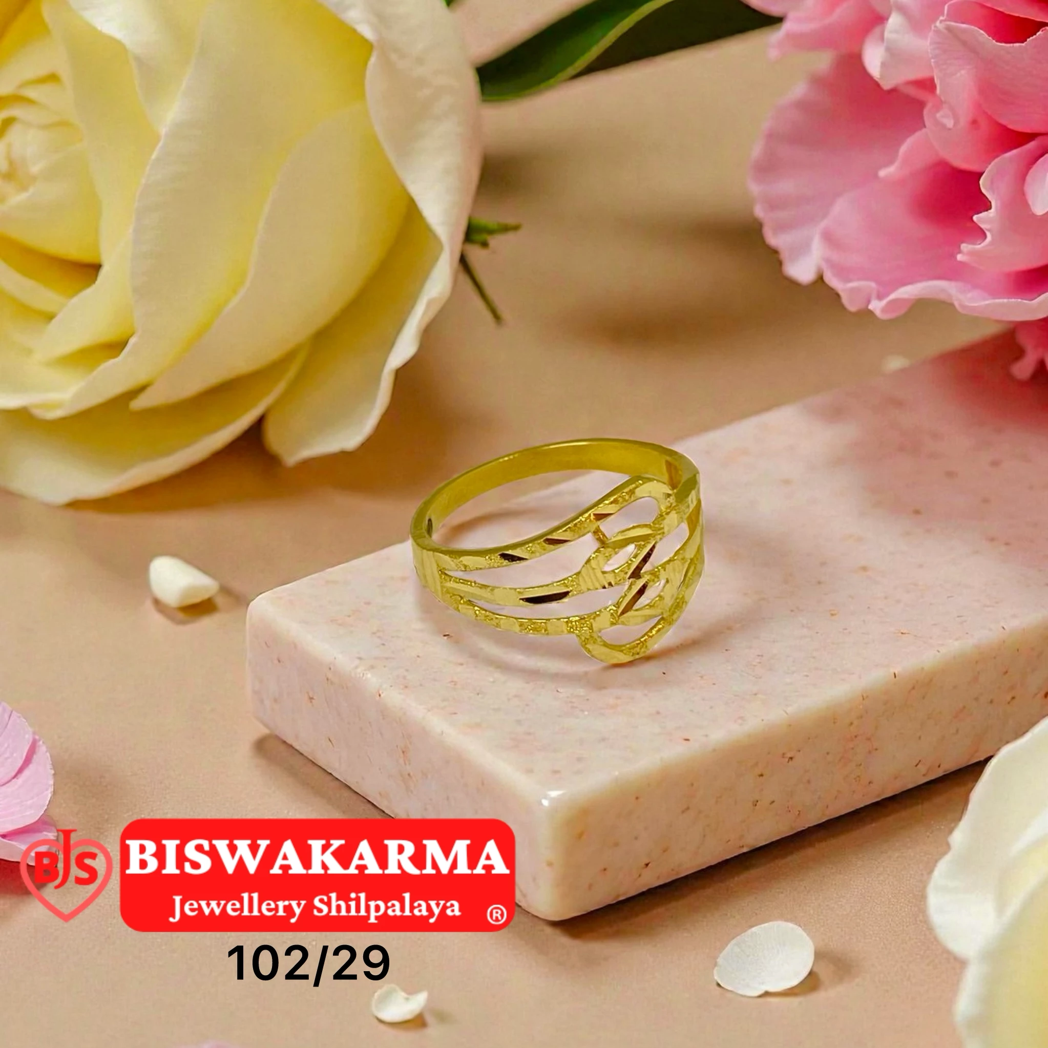 Elegant gold ladies ring with layered ribbon-style waves and open cut detailing. Smooth flowing lines, fine surface texture, and a polished handcrafted finish give it a light modern charm.