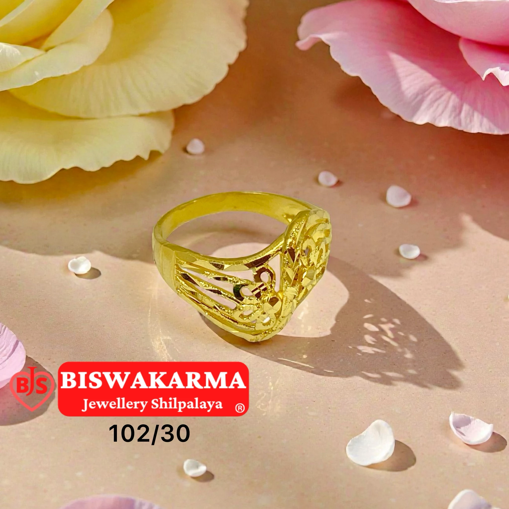 Bold gold ladies ring with a shield-shaped top featuring intricate cut and carved detailing. Smooth polished band and structured design give it a strong yet elegant handcrafted presence.
