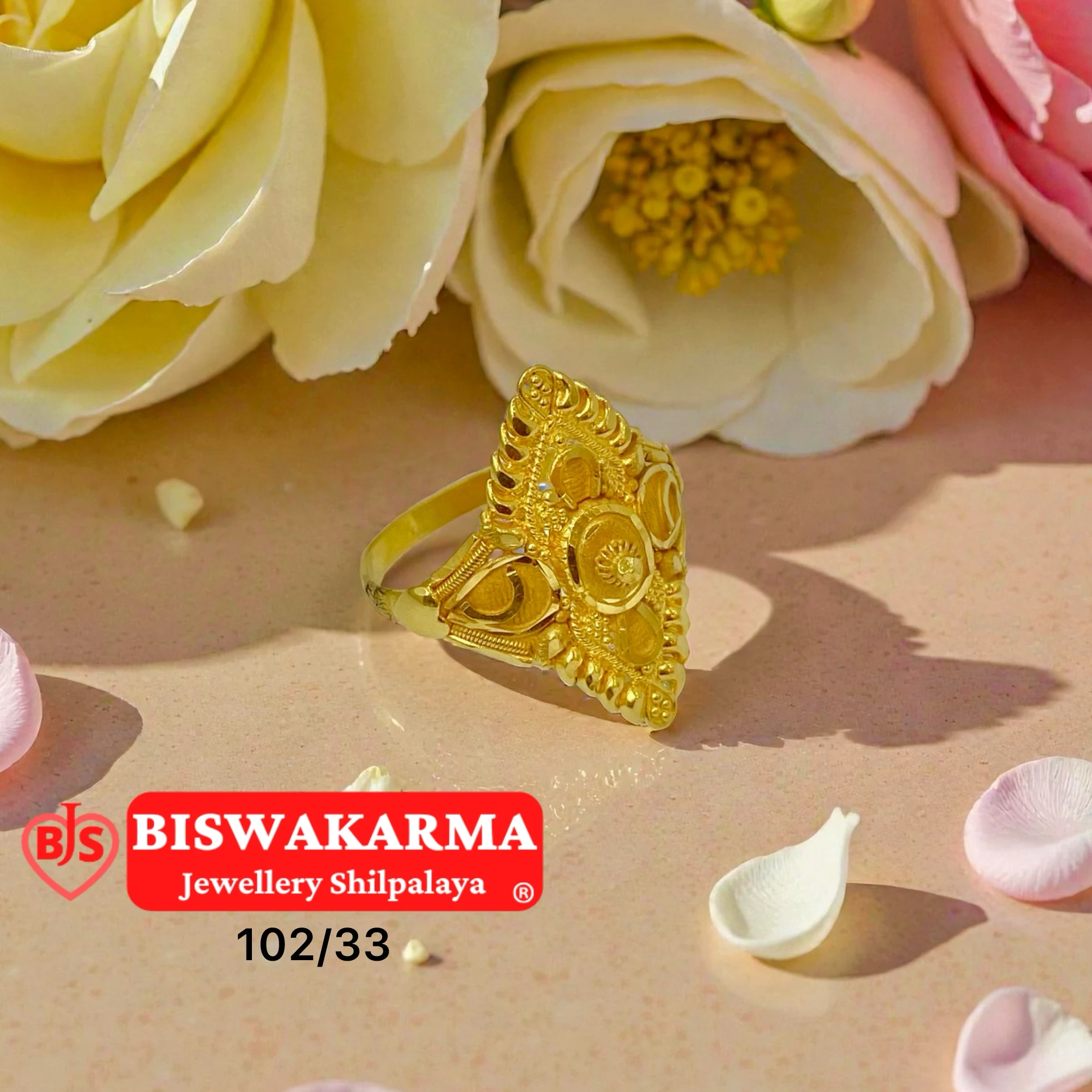 Bold gold ladies ring with a raised triangular crest design, featuring intricate hand engraving and granule detailing. Strong traditional form, rich texture, and a finely polished handcrafted finish.