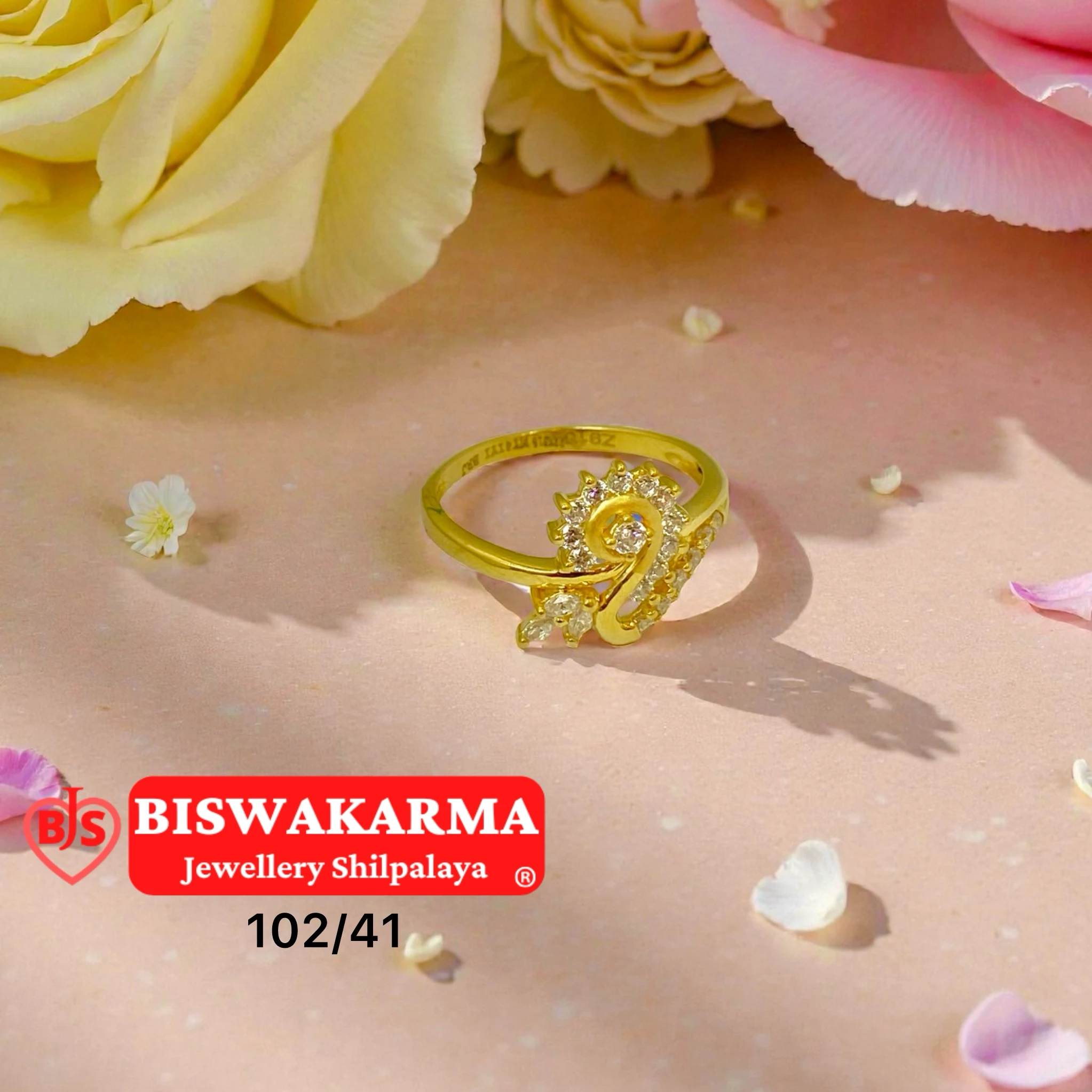 Elegant gold ladies ring with a graceful spiral motif, accented by diamond-finish stones. Fine prong setting, smooth polish, and balanced handcrafted detailing create a refined look.
