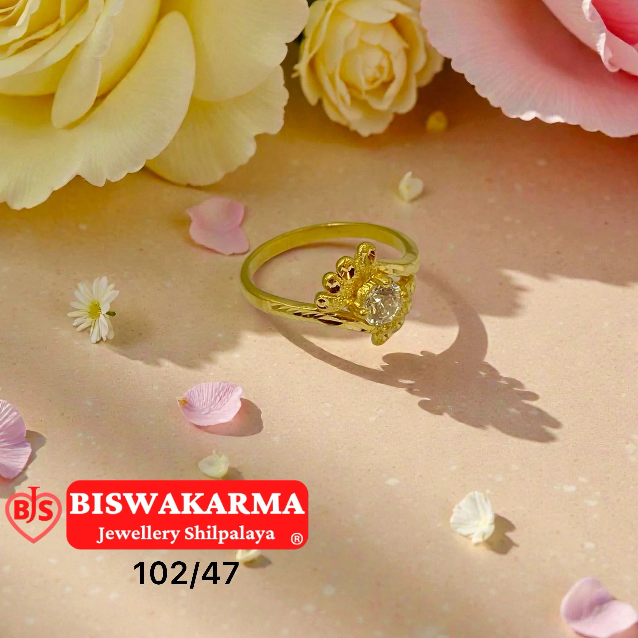 Elegant gold ladies ring with a crown-style raised setting, featuring a single diamond-finish stone. Fine cutwork, bead accents, and smooth polish give a refined handcrafted look.