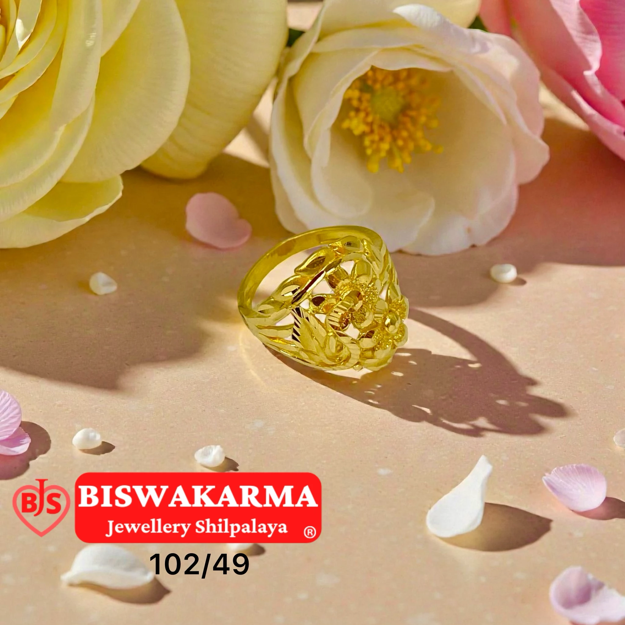 Artfully crafted gold ladies ring featuring layered floral filigree with pierced leaf details. Soft curves, fine texture work, and a graceful open design create a rich yet airy finish.
