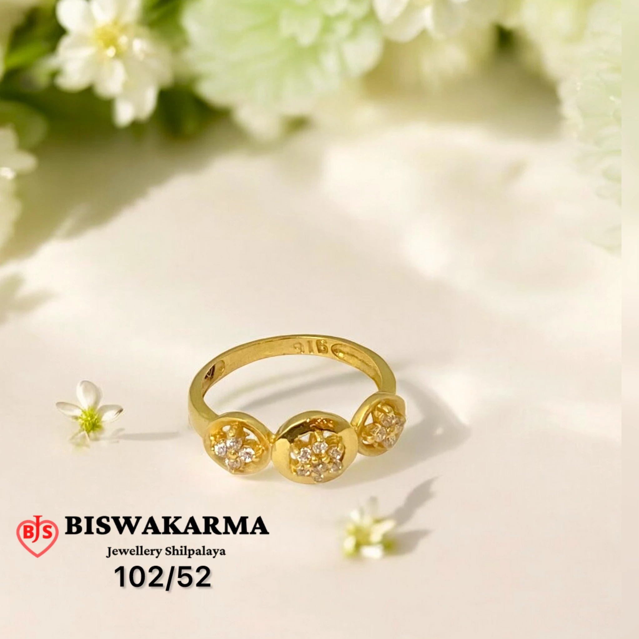 Graceful gold ladies ring with three round halo settings, each adorned with diamond-finish stones. Smooth polished band with neat setting work and a refined modern touch.