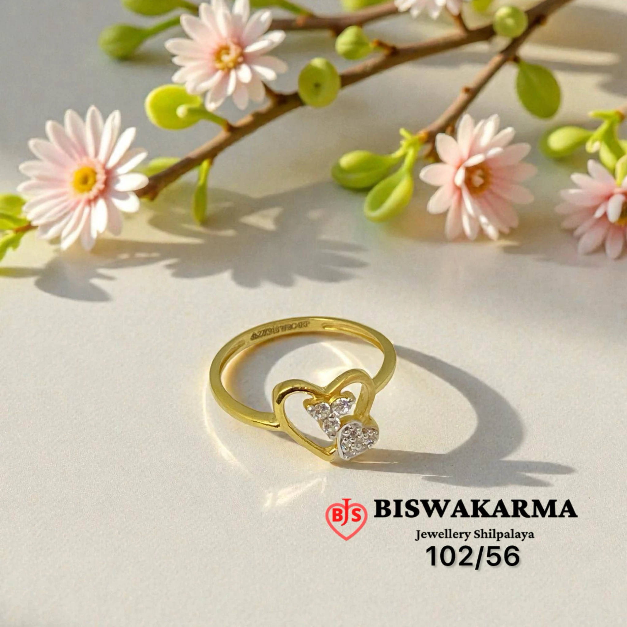 Delicate gold ring with an open twin-heart motif, accented by sparkling diamond-finish stones. Smooth polished band with fine setting work and a soft romantic look.