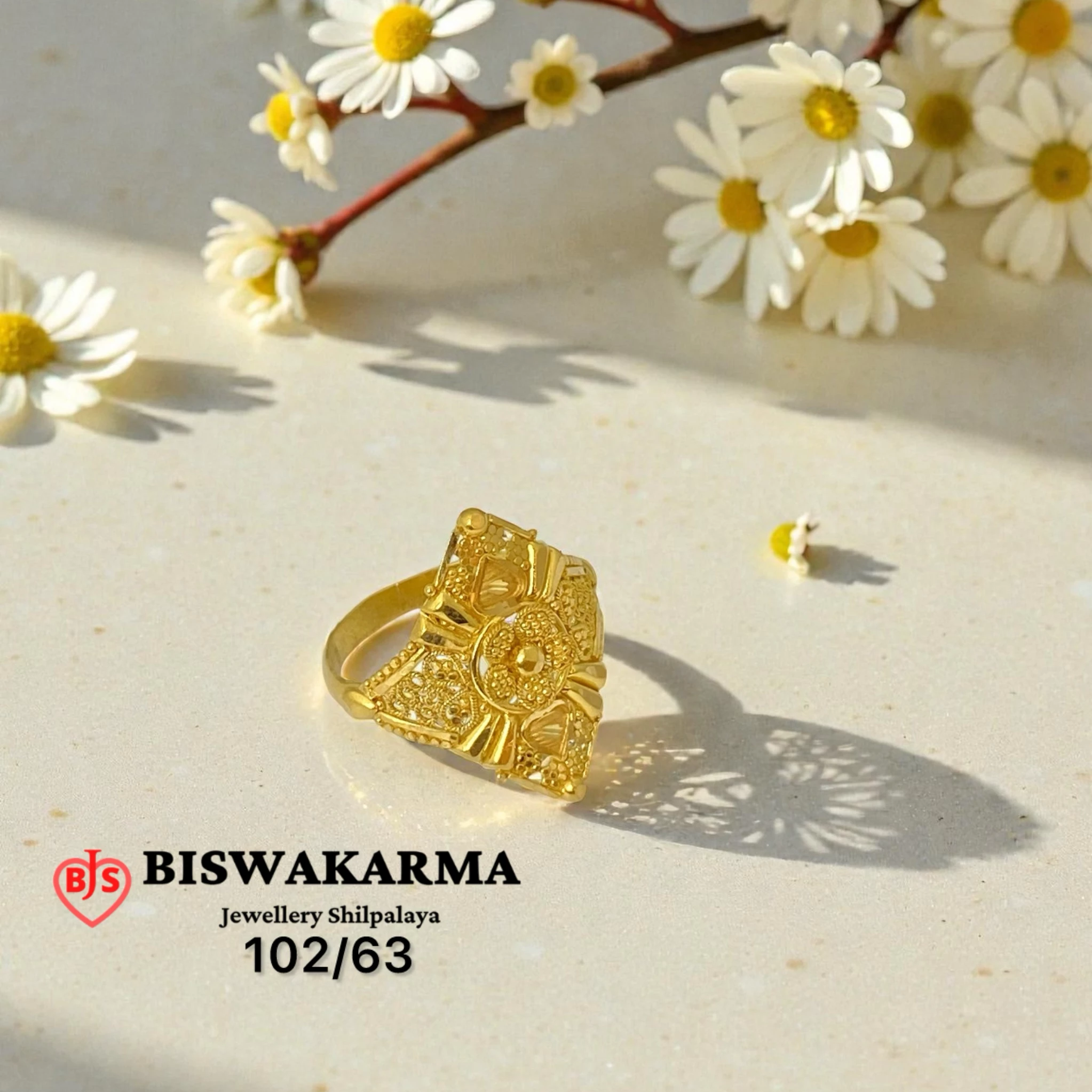 Bold gold ladies ring with a shield-shaped face, featuring intricate hand engraving, granule detailing, and layered traditional motifs finished with rich polished craftsmanship.