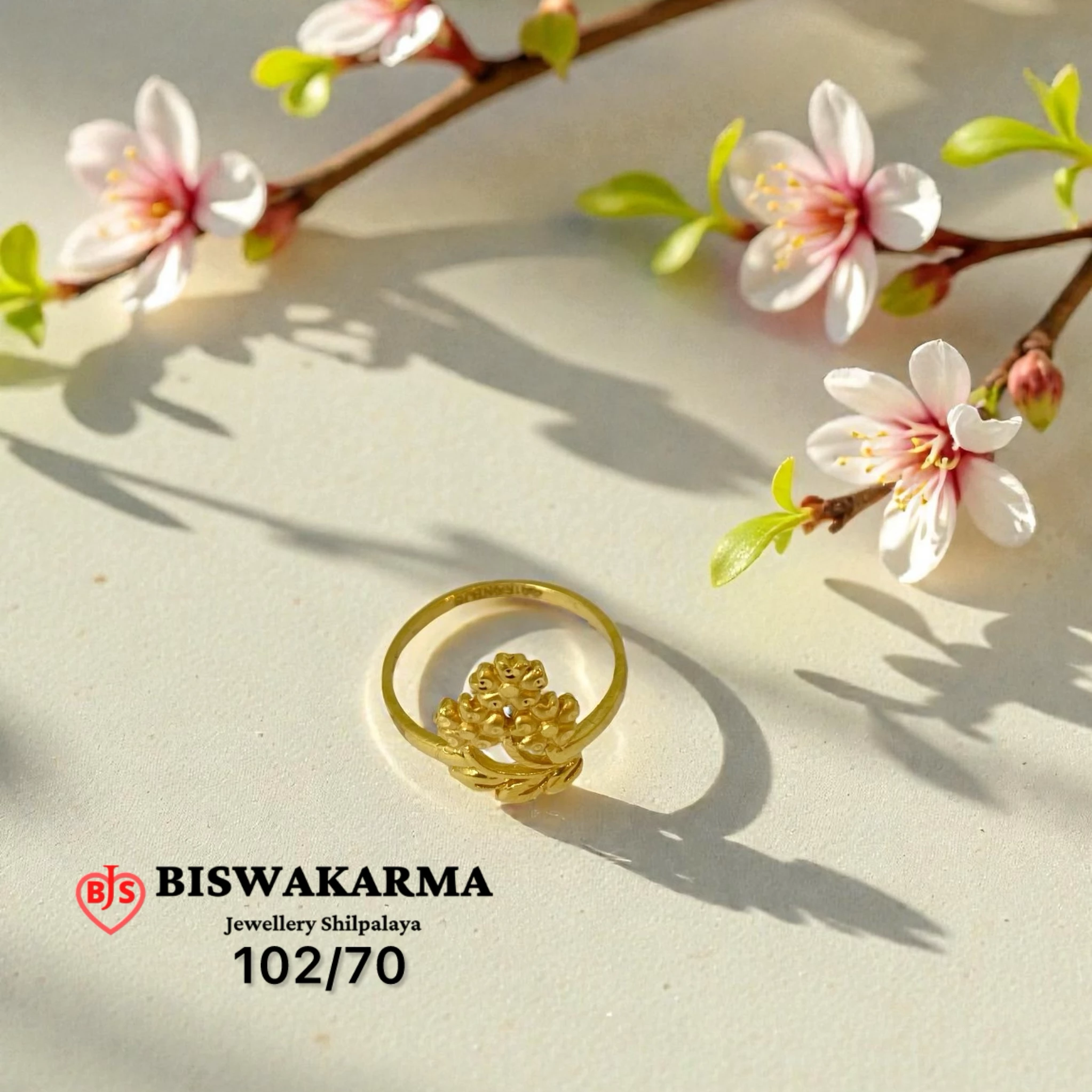 Graceful gold ladies ring crafted with a clustered blossom motif and soft leaf accents. Fine detailing and a smooth polished band give it a delicate, nature-inspired handcrafted charm.