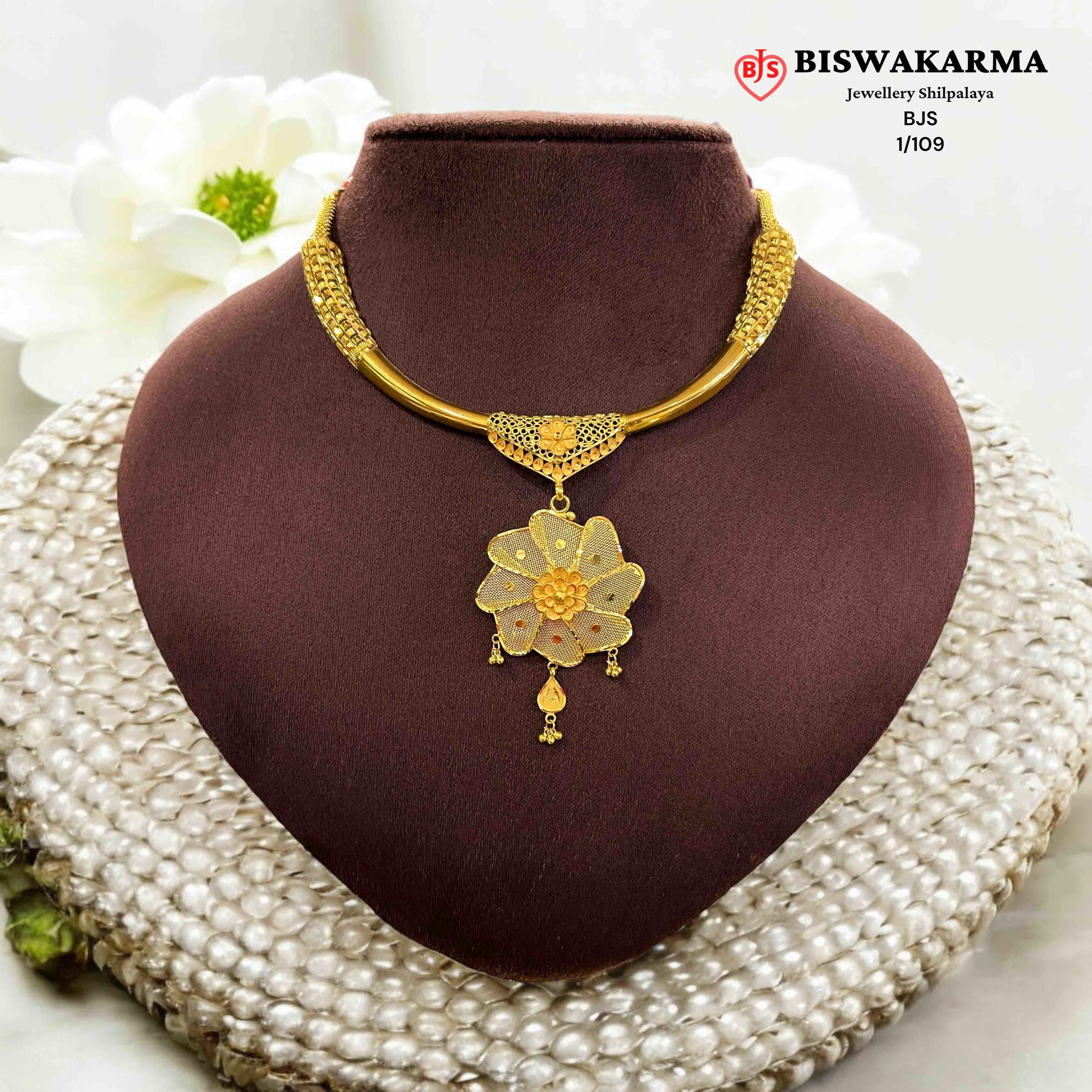 This necklace features a smooth tubular gold neck curve paired with a finely pierced floral mesh pendant. The layered flower form and soft drop detailing give it a graceful, handcrafted finish with classic balance.
