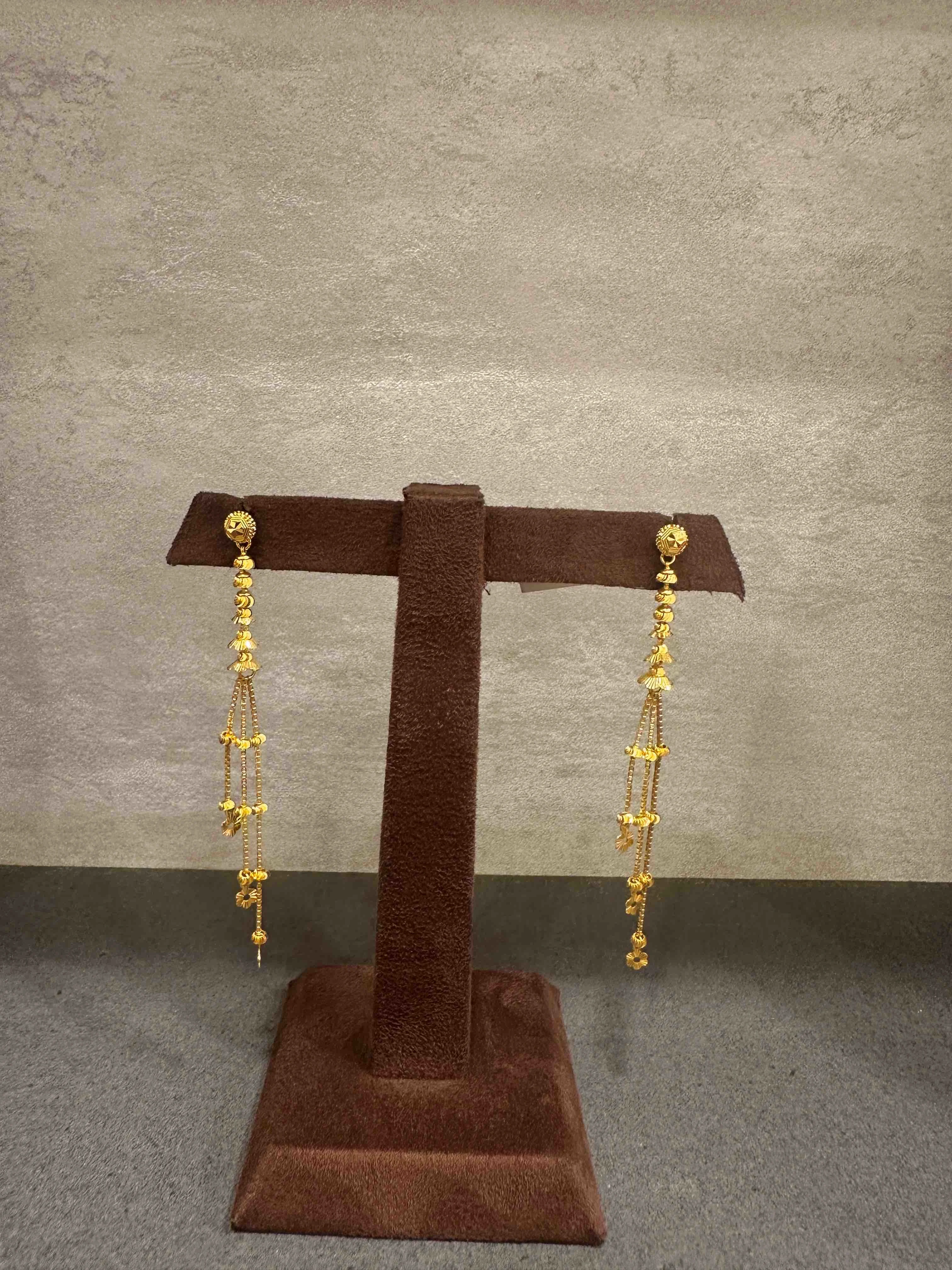 Elegant gold earrings featuring a sleek cascading chain design with bead accents, perfect for adding grace and length to festive looks.