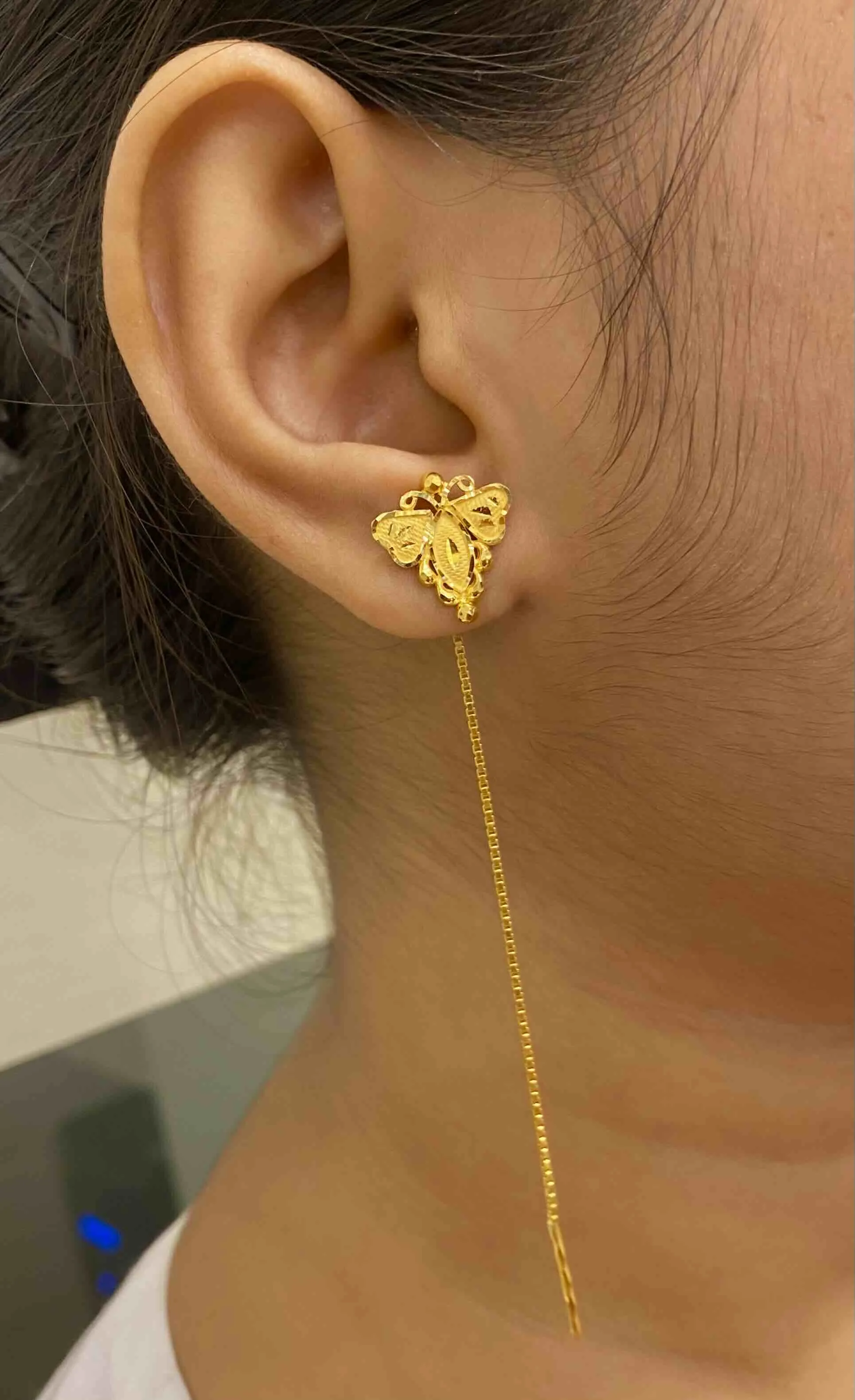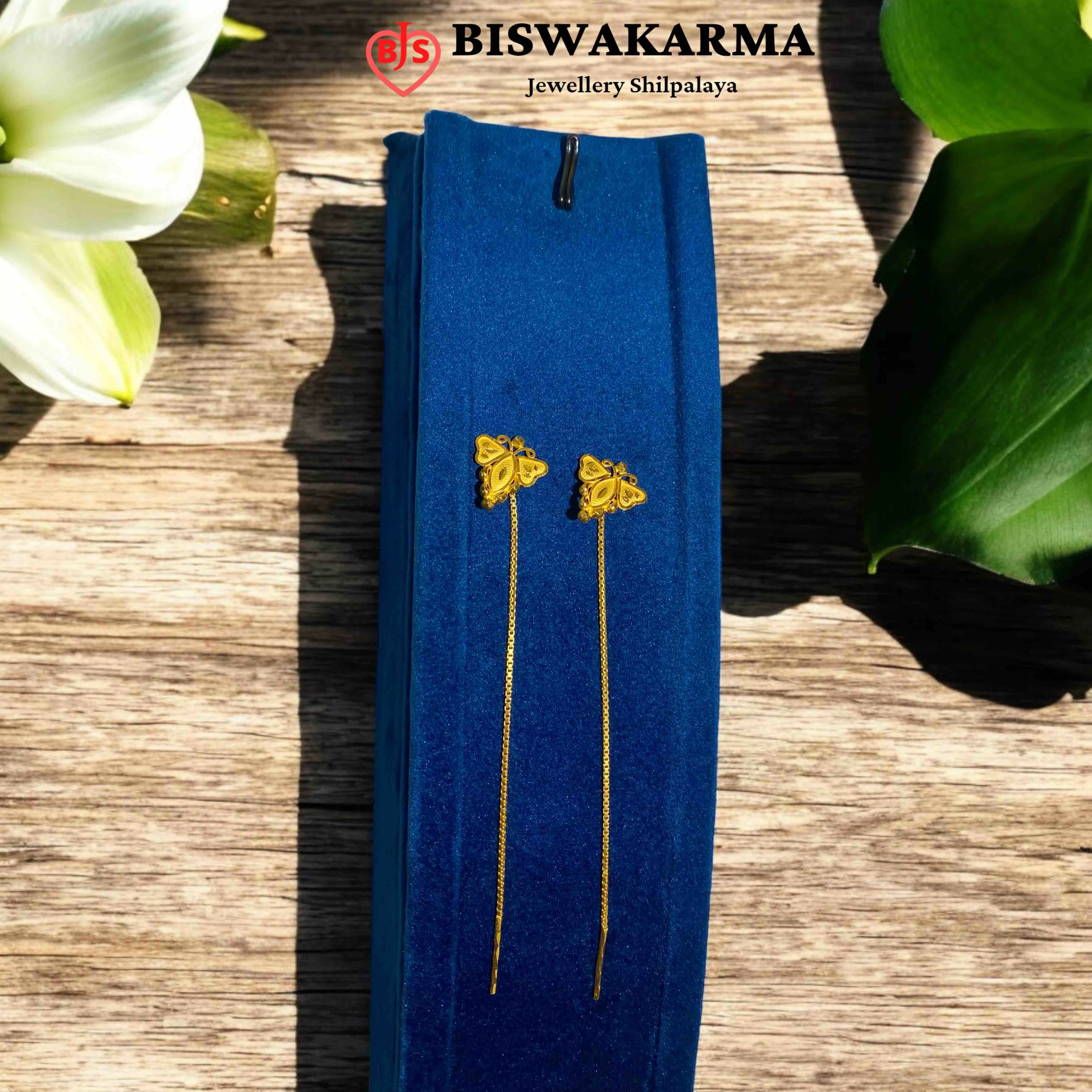 These charming floral Sui Suto earrings feature delicate flower tops and sleek golden threads that sway gently with movement, offering an elegant minimalist style.