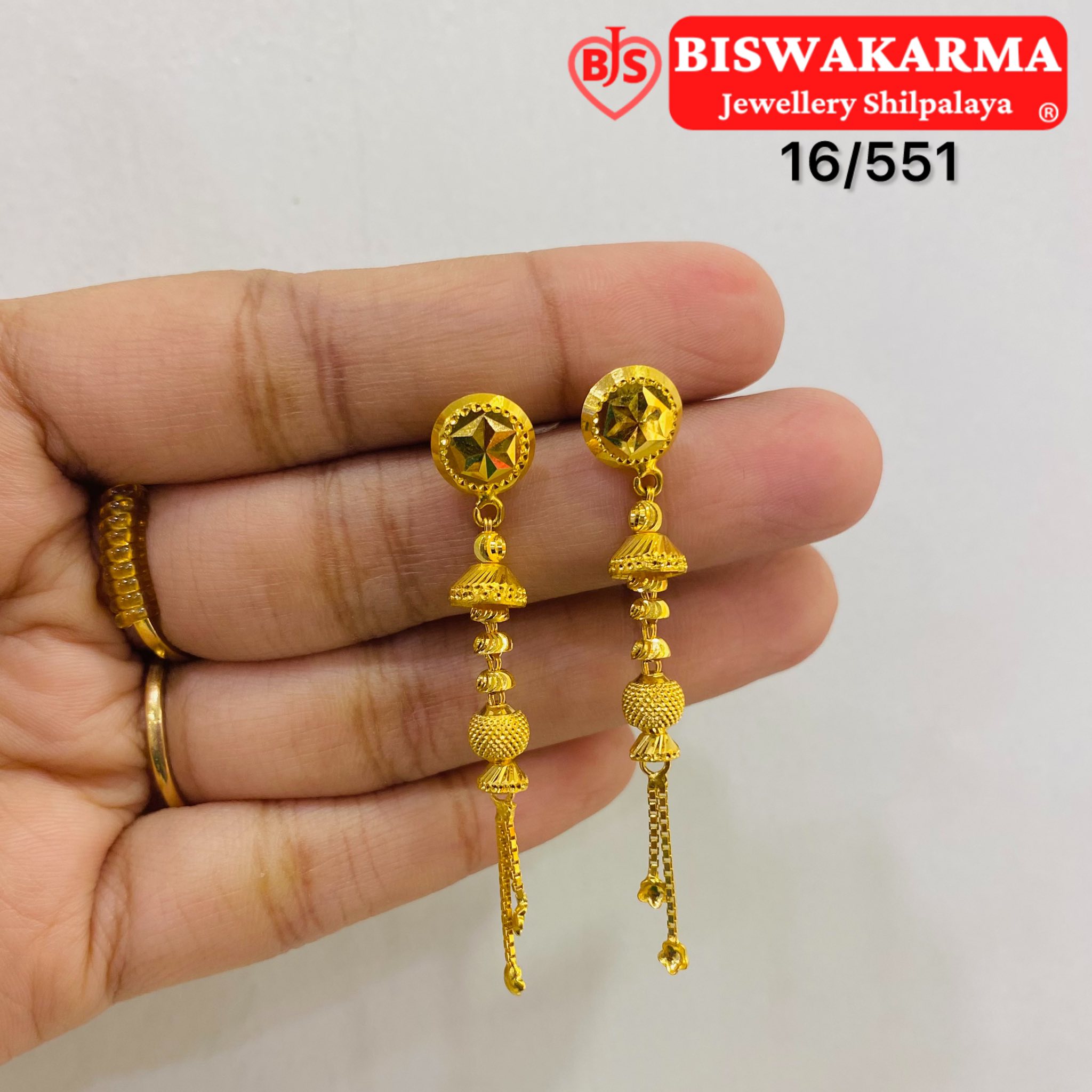 Elegant gold earrings with layered bead detailing and slim hanging drops, adding a graceful festive shine to any occasion.