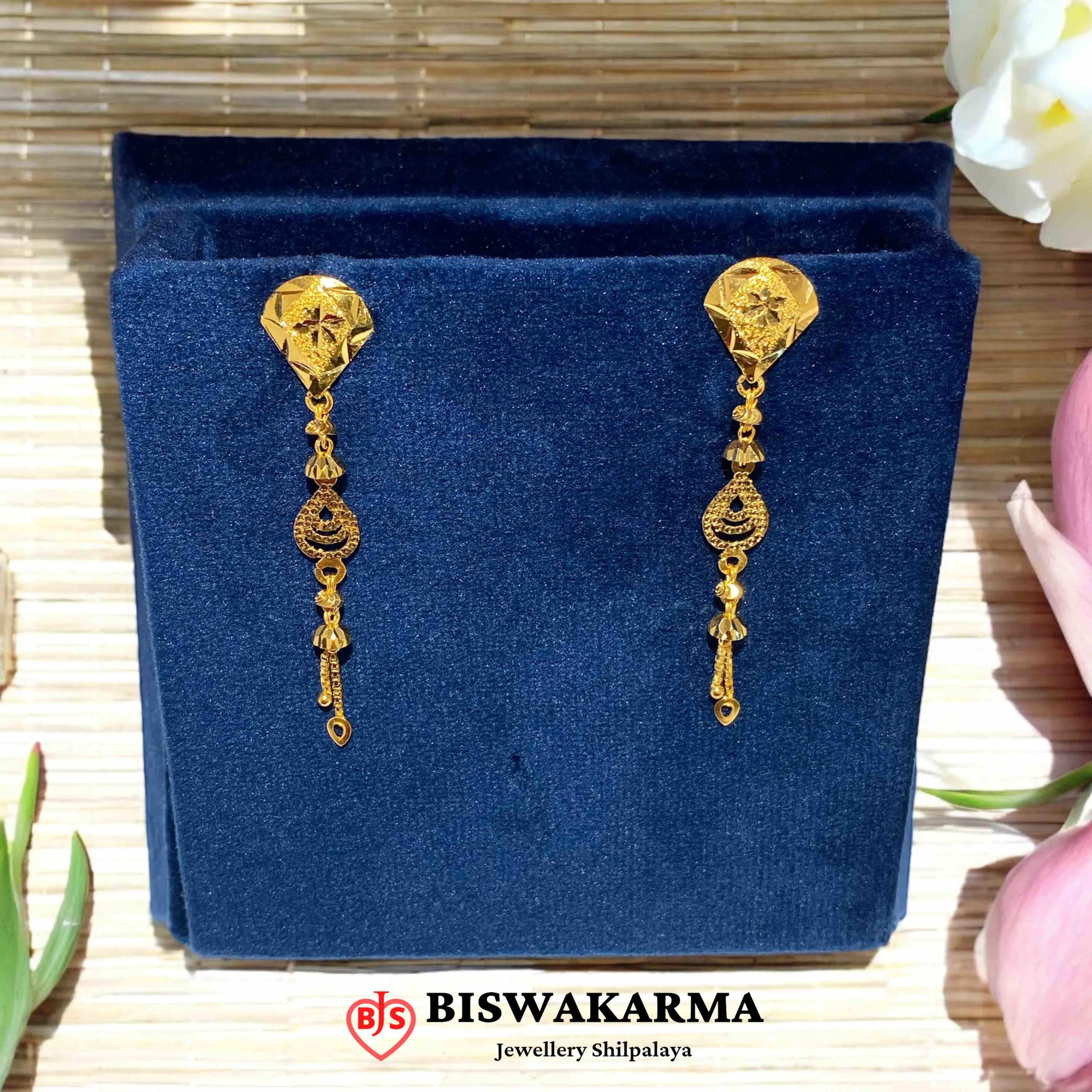 Stylish gold earrings with intricate long drop detailing, adding a touch of elegance and traditional charm to your festive style.