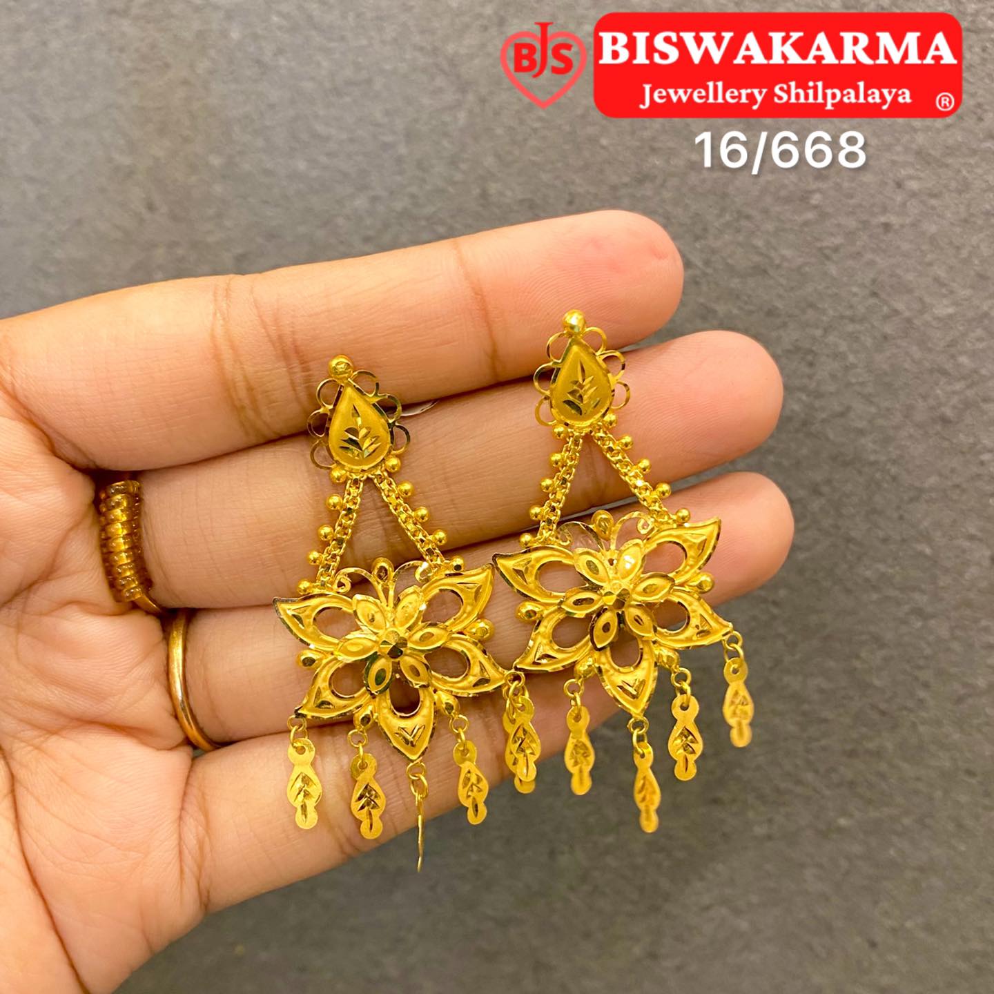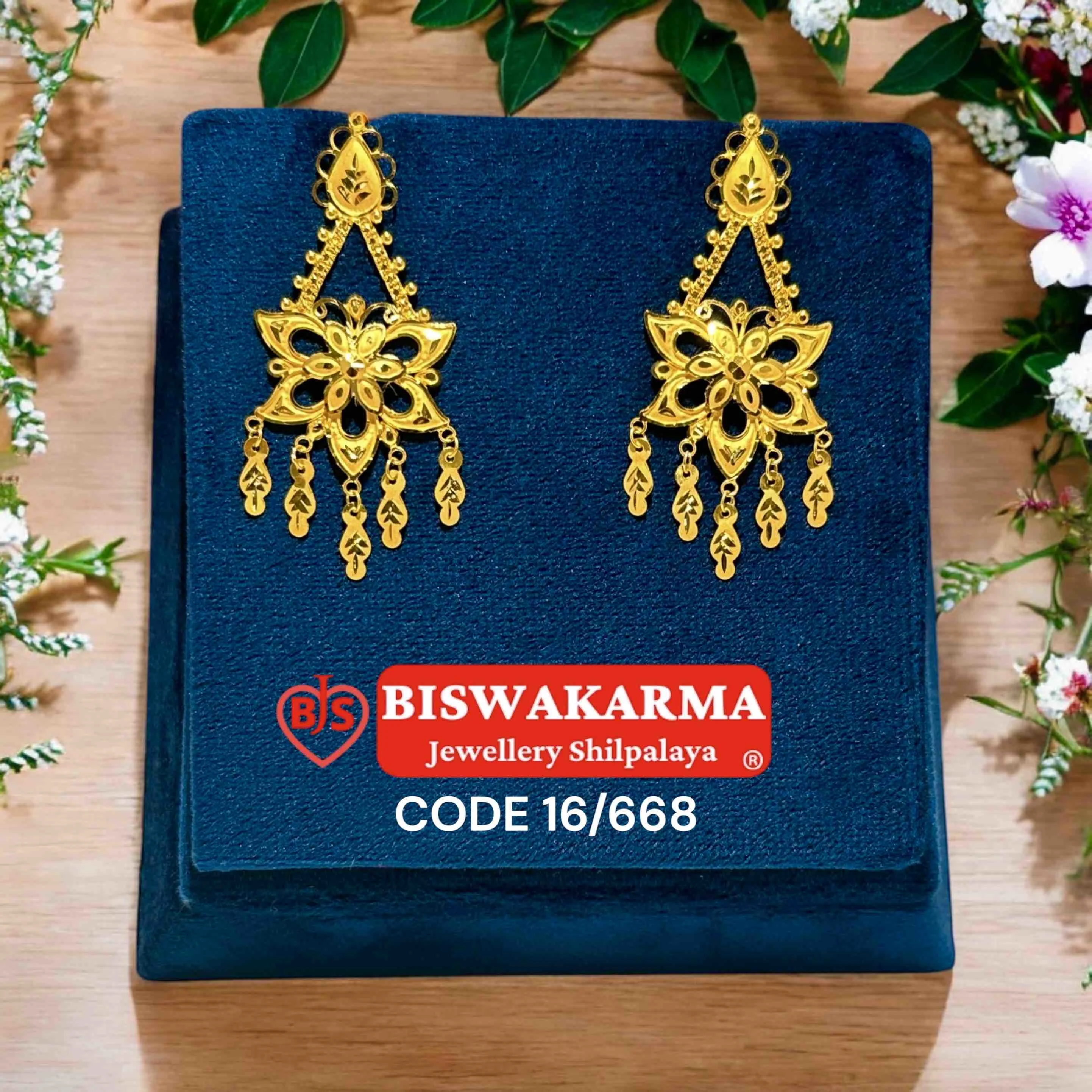 These earrings feature an ornate floral shape with cascading golden drops, creating a graceful butterfly-like silhouette. Perfect for festive and elegant occasions, they bring charm and sophistication to every outfit.