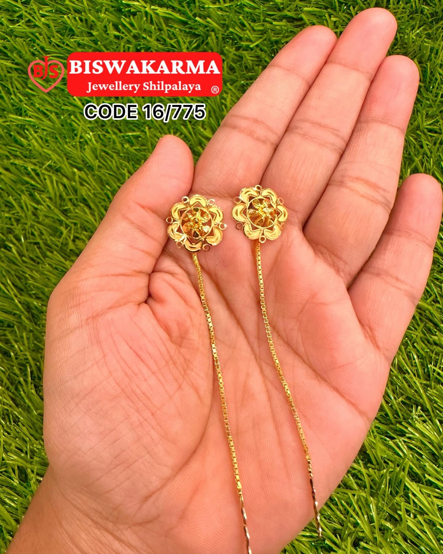 These elegant Sui Suto earrings feature a floral petal motif on top with fine gold threads hanging down, creating a minimal yet stunning look for any occasion.