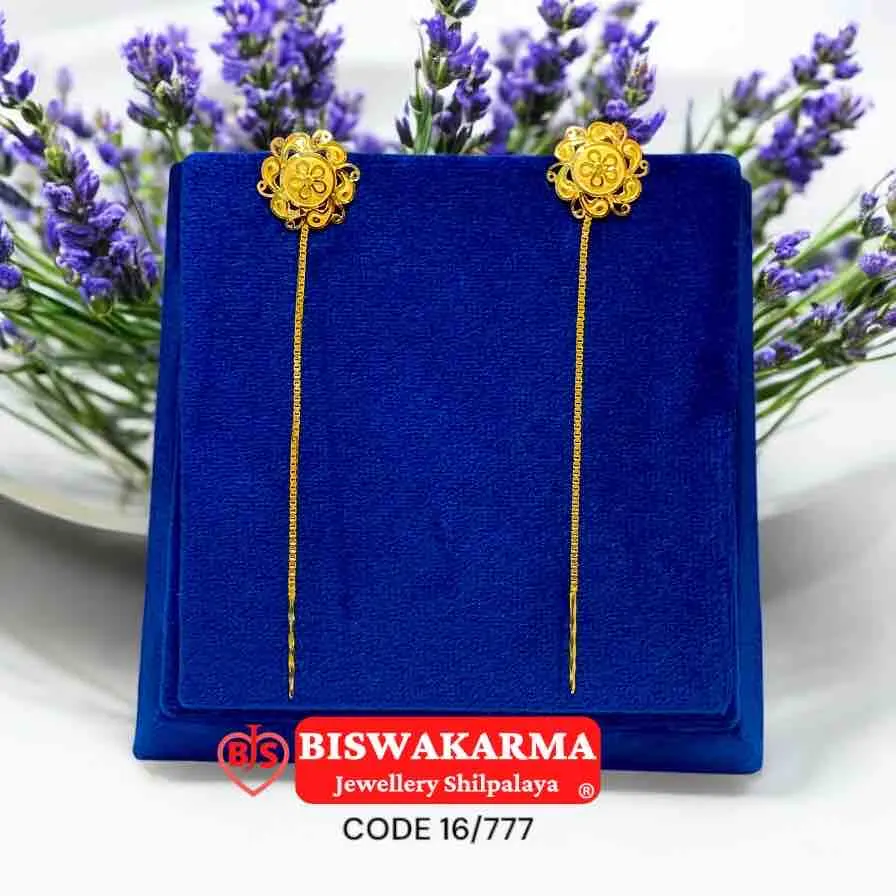 Graceful Sui Suto earrings with elegant floral tops and long gold threads that shimmer with every move, giving a sleek and modern festive look.