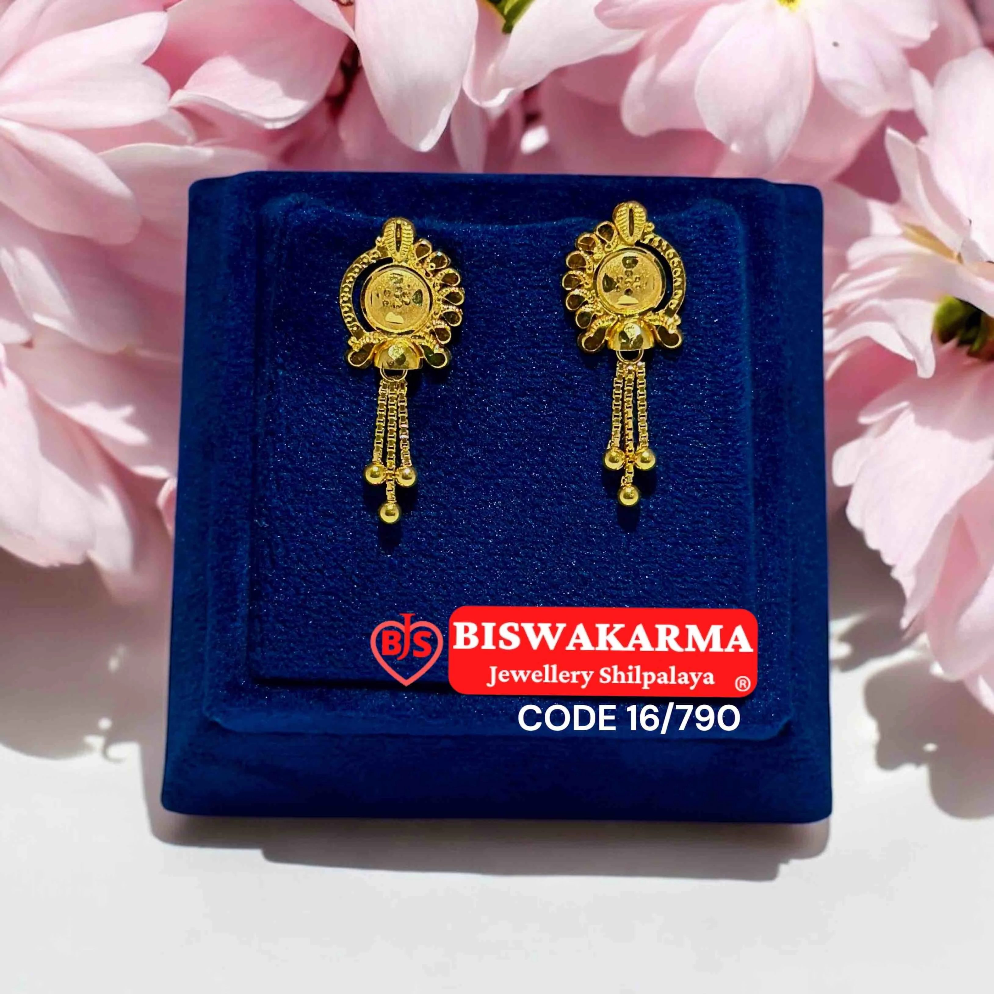 These elegant gold earrings feature a graceful petal-inspired motif with tiny bead drops that sway gently. A perfect pick for festive or classic wear.