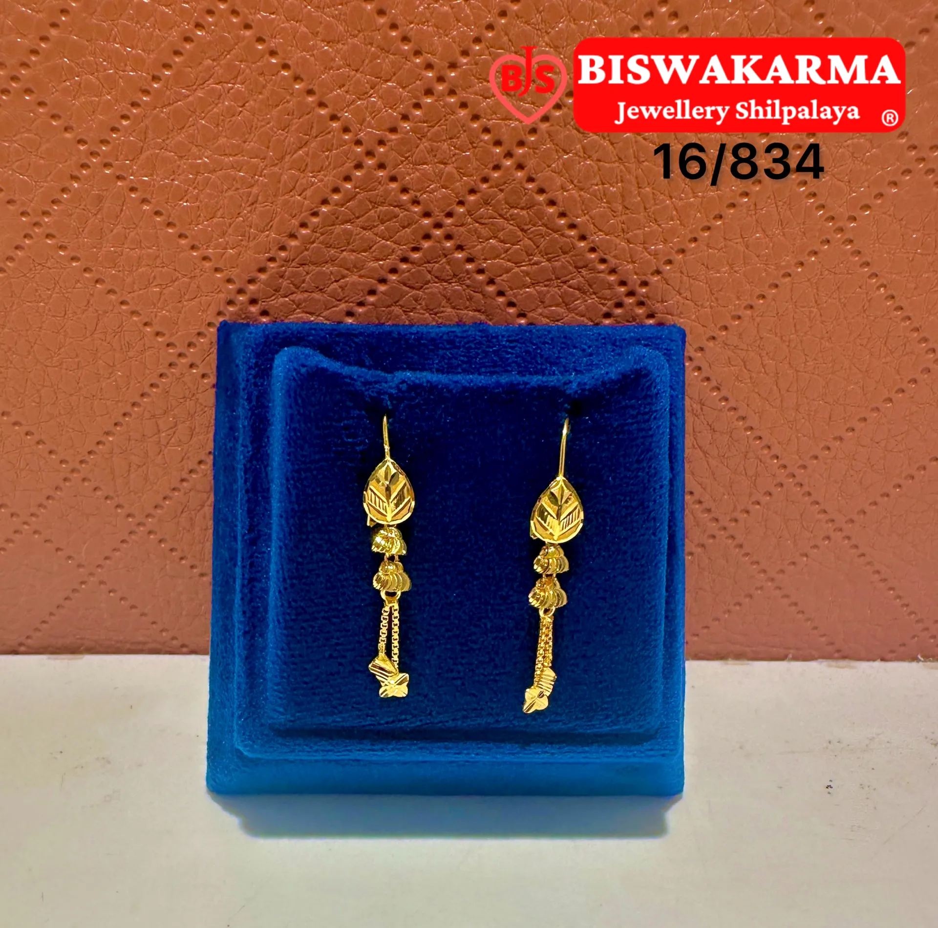 Beautiful gold earrings with leaf-shaped tops and fine hanging chains. Lightweight and elegant, ideal for both festive and everyday wear.