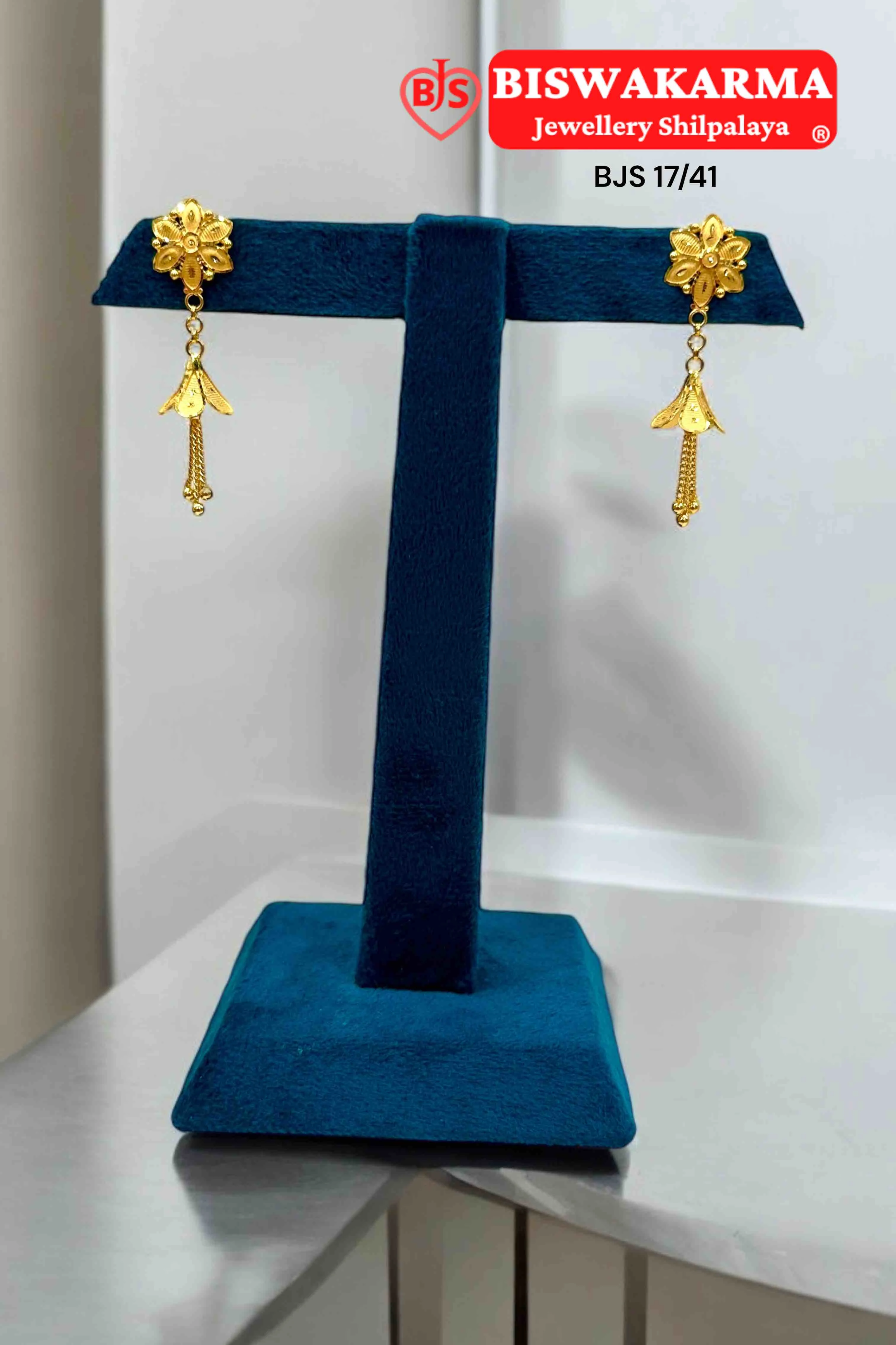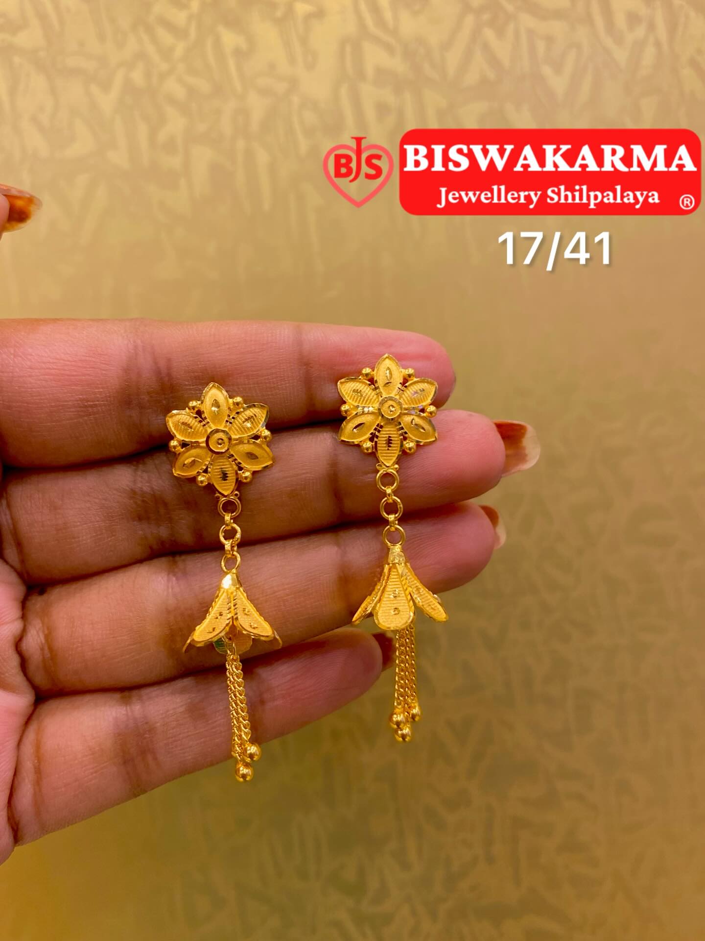 Charming gold jhumko earrings with petal-shaped drops and floral tops, adding a touch of soft elegance to your festive look.