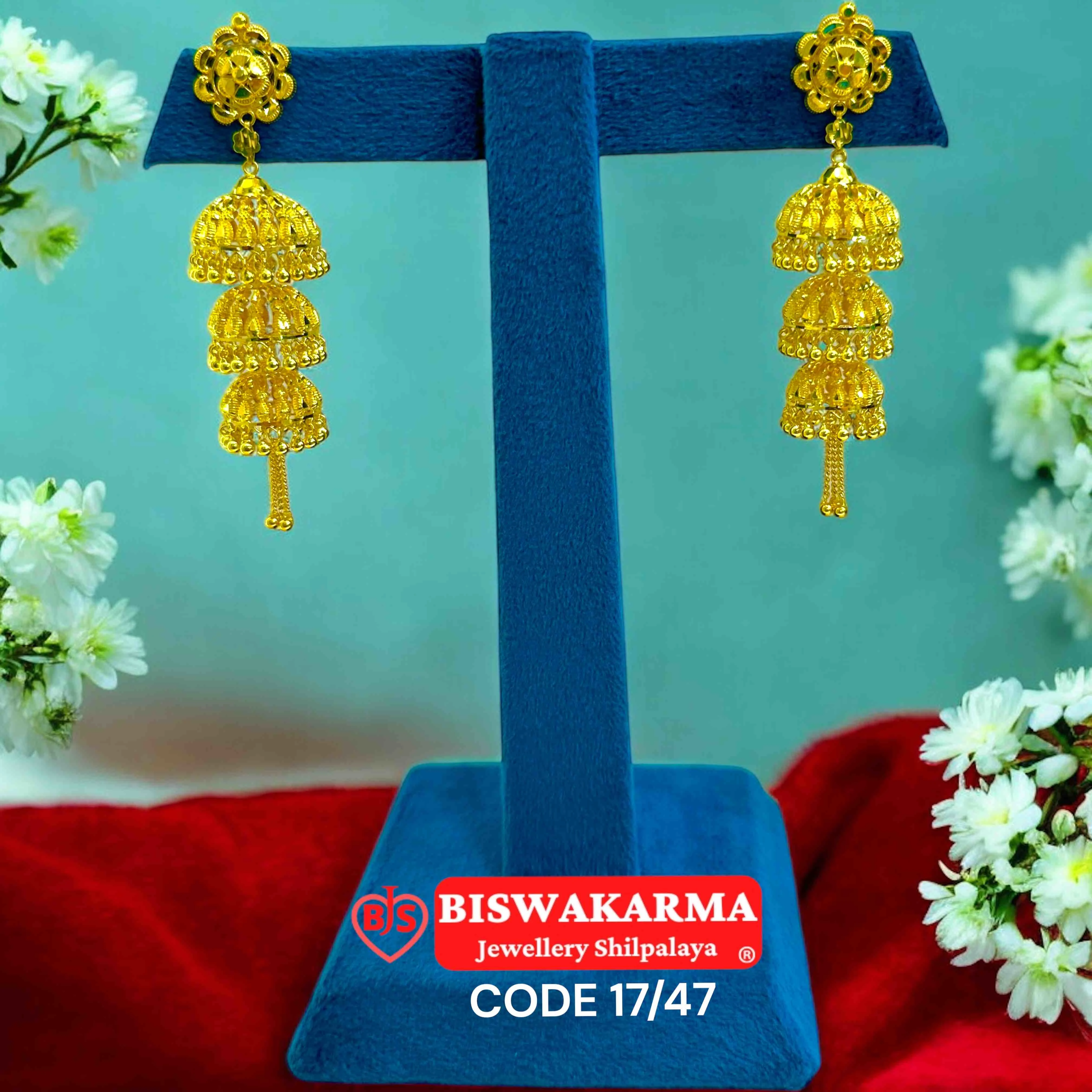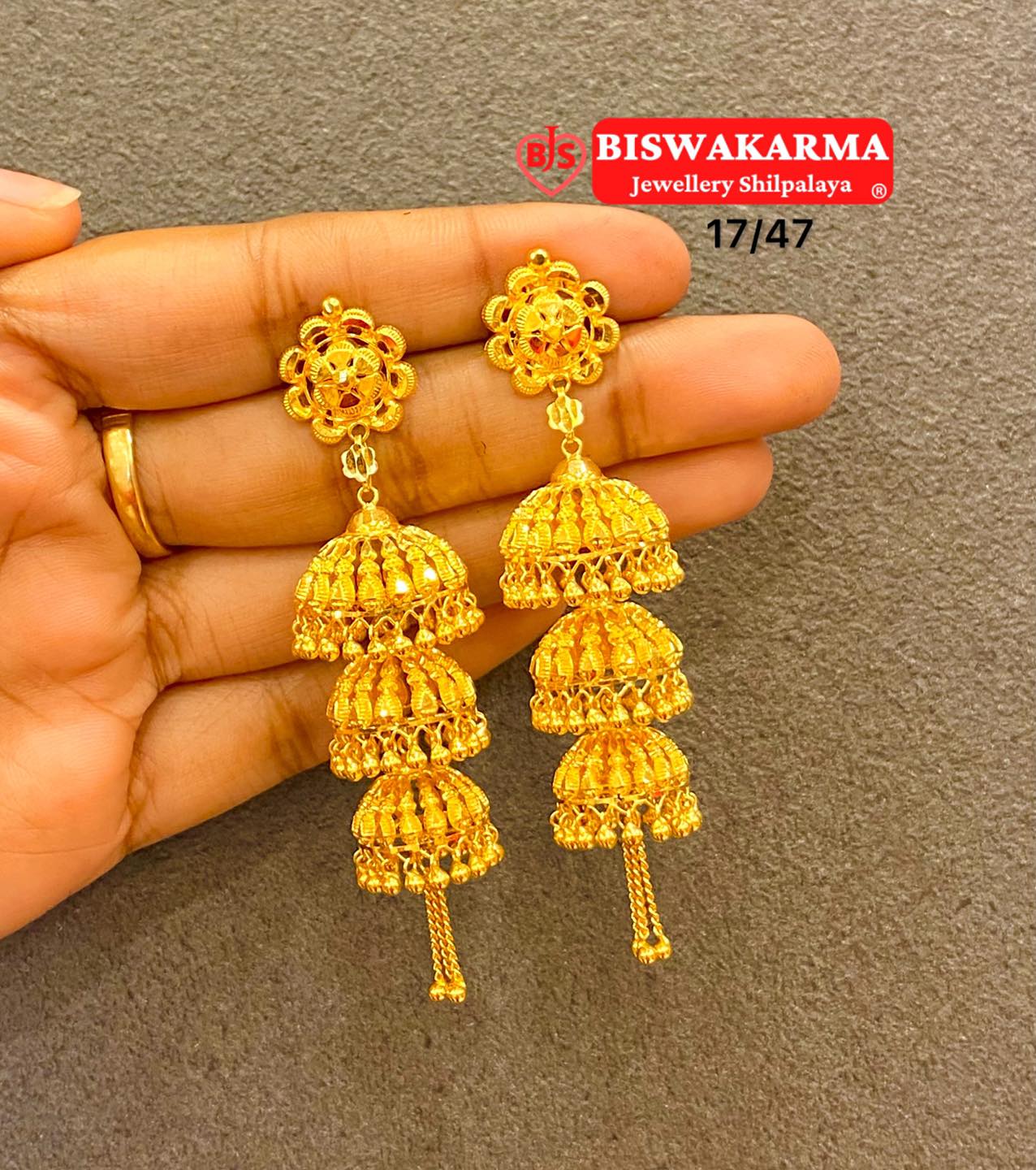Stunning triple-tier gold jhumko earrings with floral tops, designed to give a grand festive sparkle and timeless elegance.