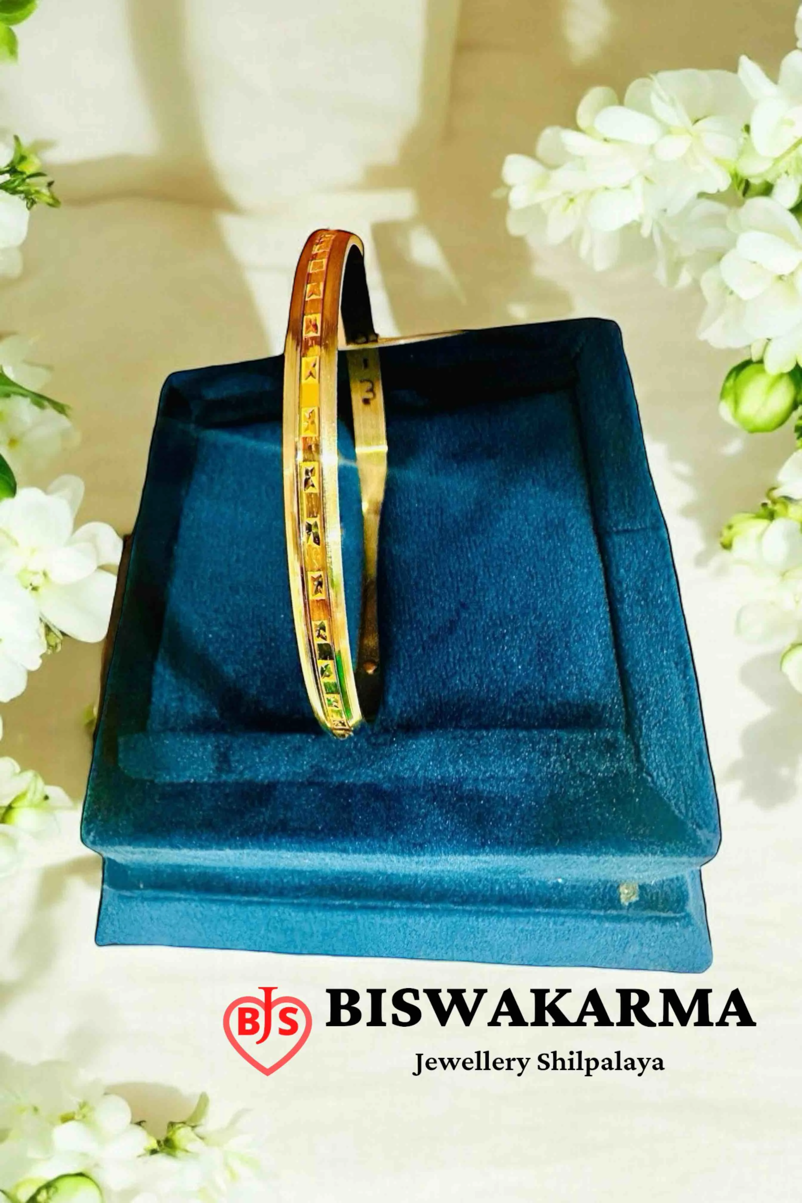 The slim gold band with tiny square cuts and clean bordered lines gives this noa a simple, graceful charm. Its smooth shine and neat detailing make the design feel warm and eye-catching.