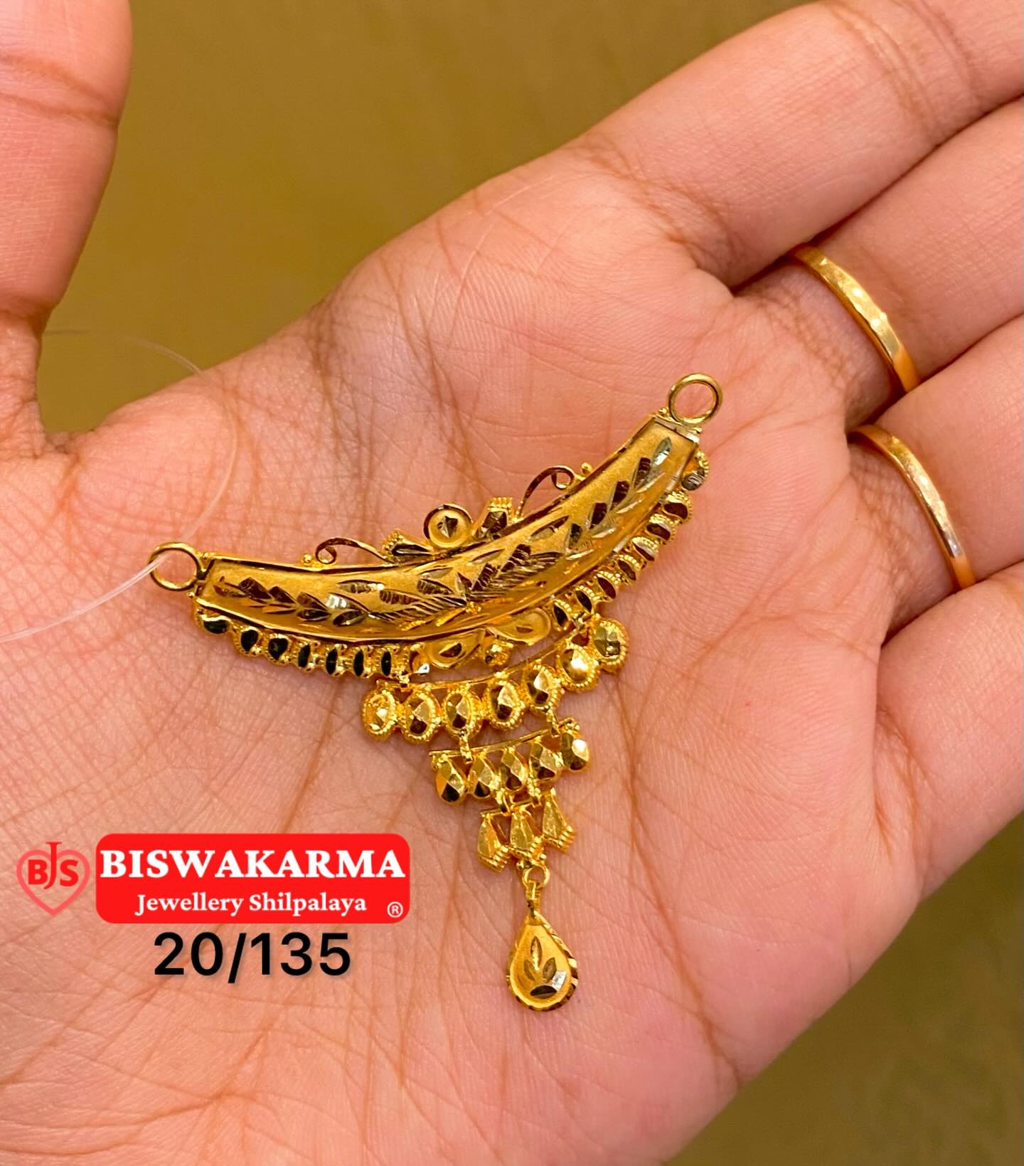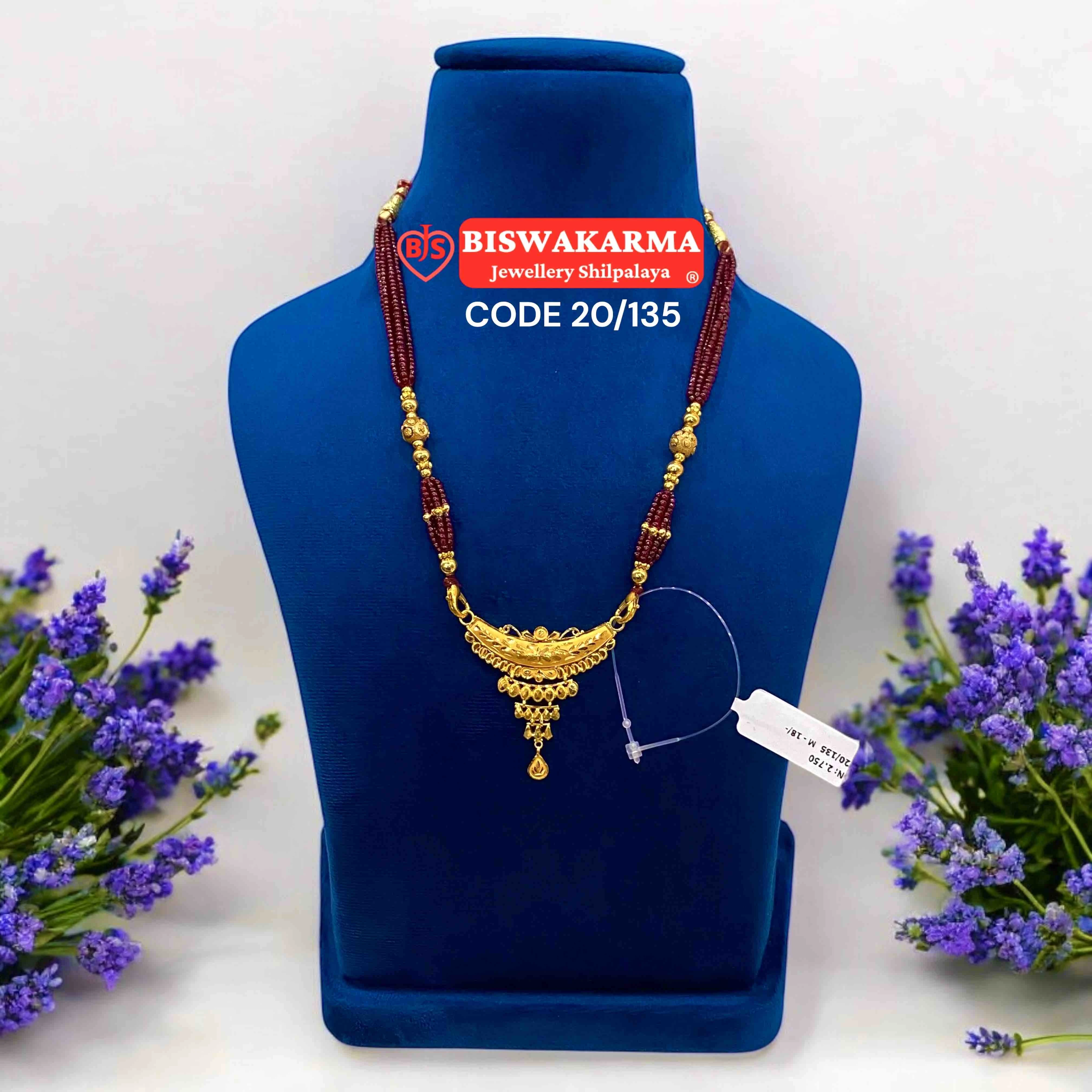 Elegant crescent gold pendant with hanging drops and red bead strands, blending classic beauty with rich traditional artistry.