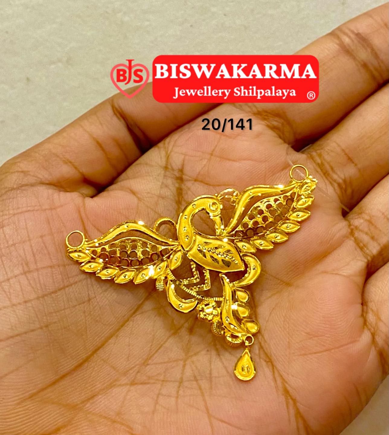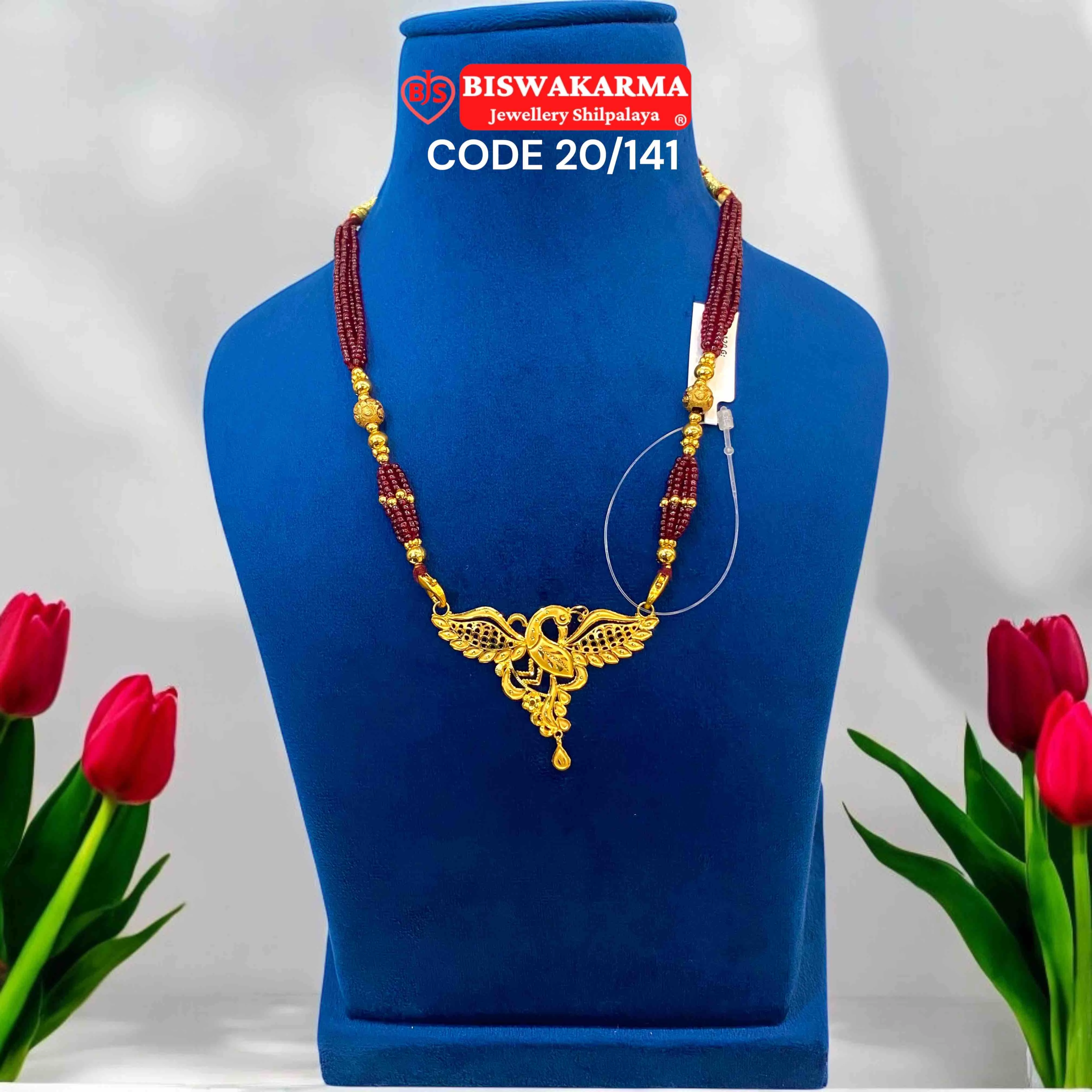 Striking gold winged floral pendant on layered red beads, blending bold elegance with classic festive beauty.