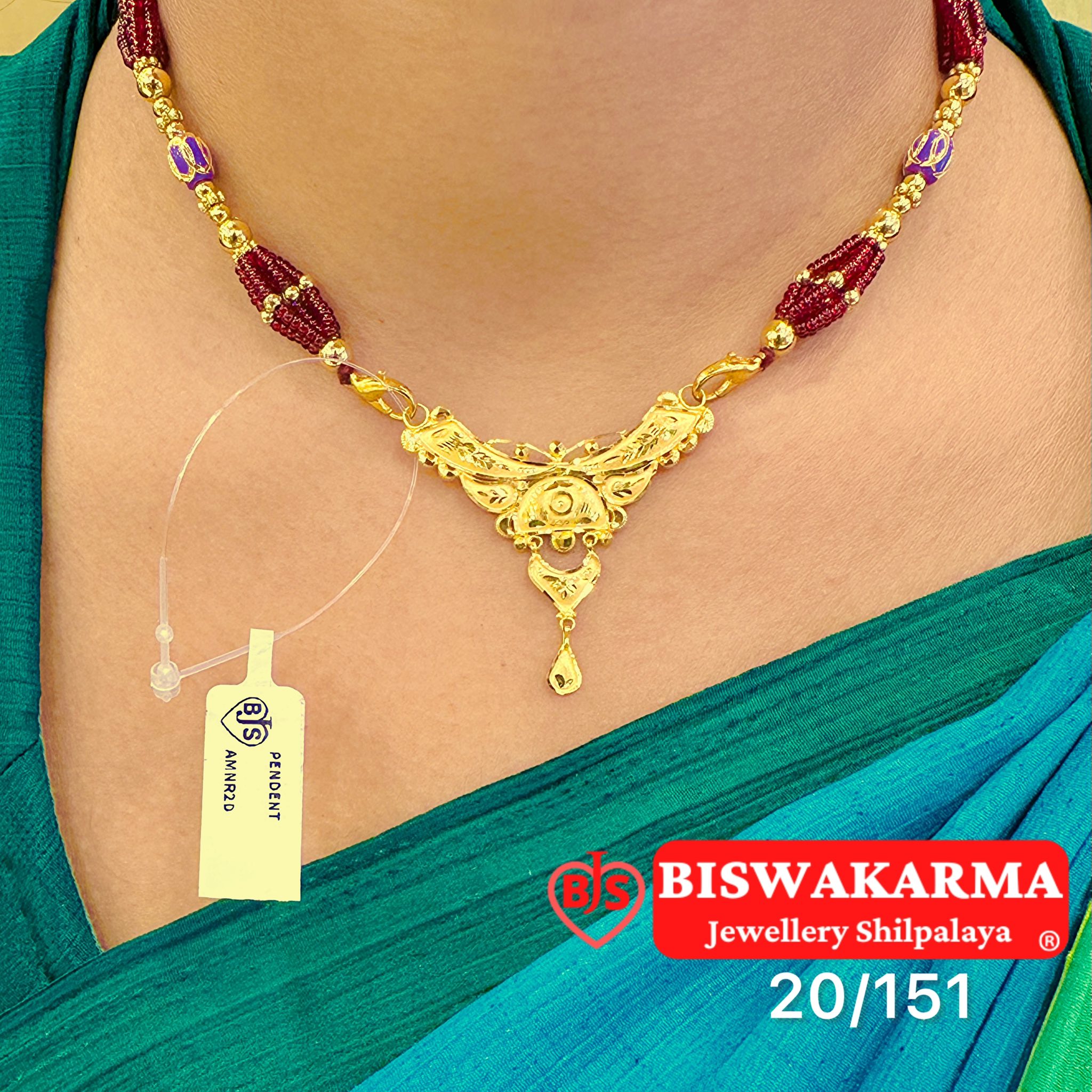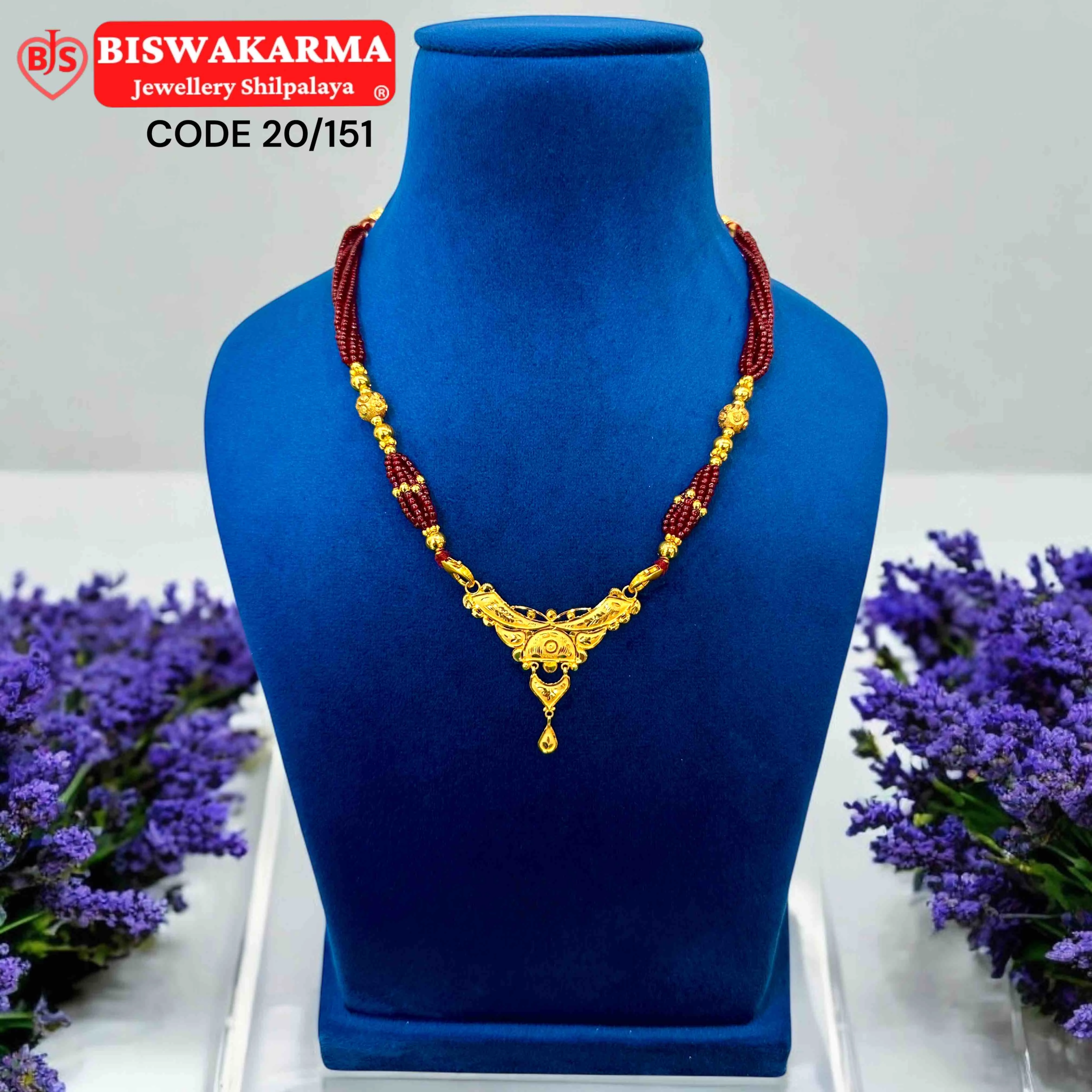 Detailed round floral gold pendant paired with red beads and gold accents, blending festive beauty with timeless tradition.