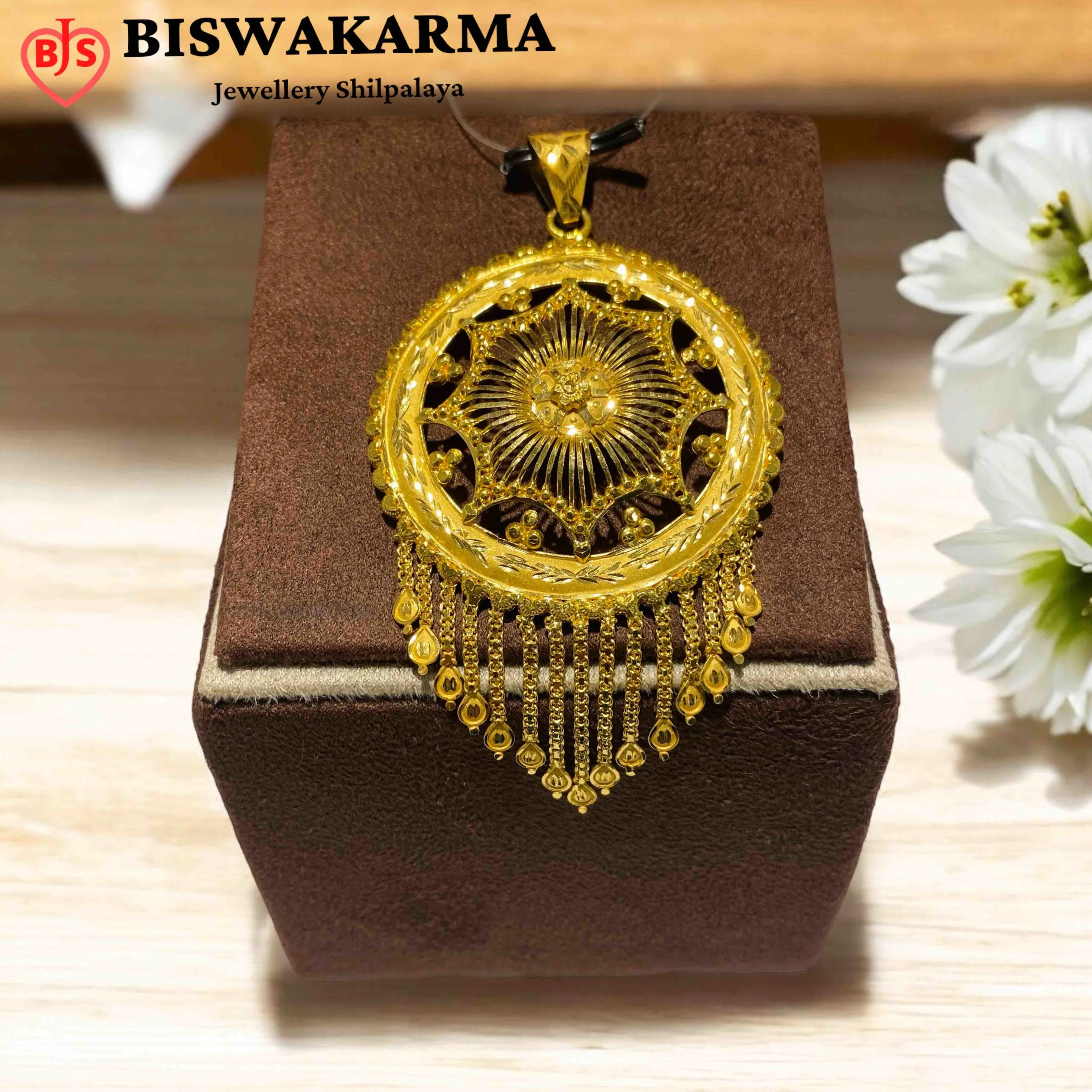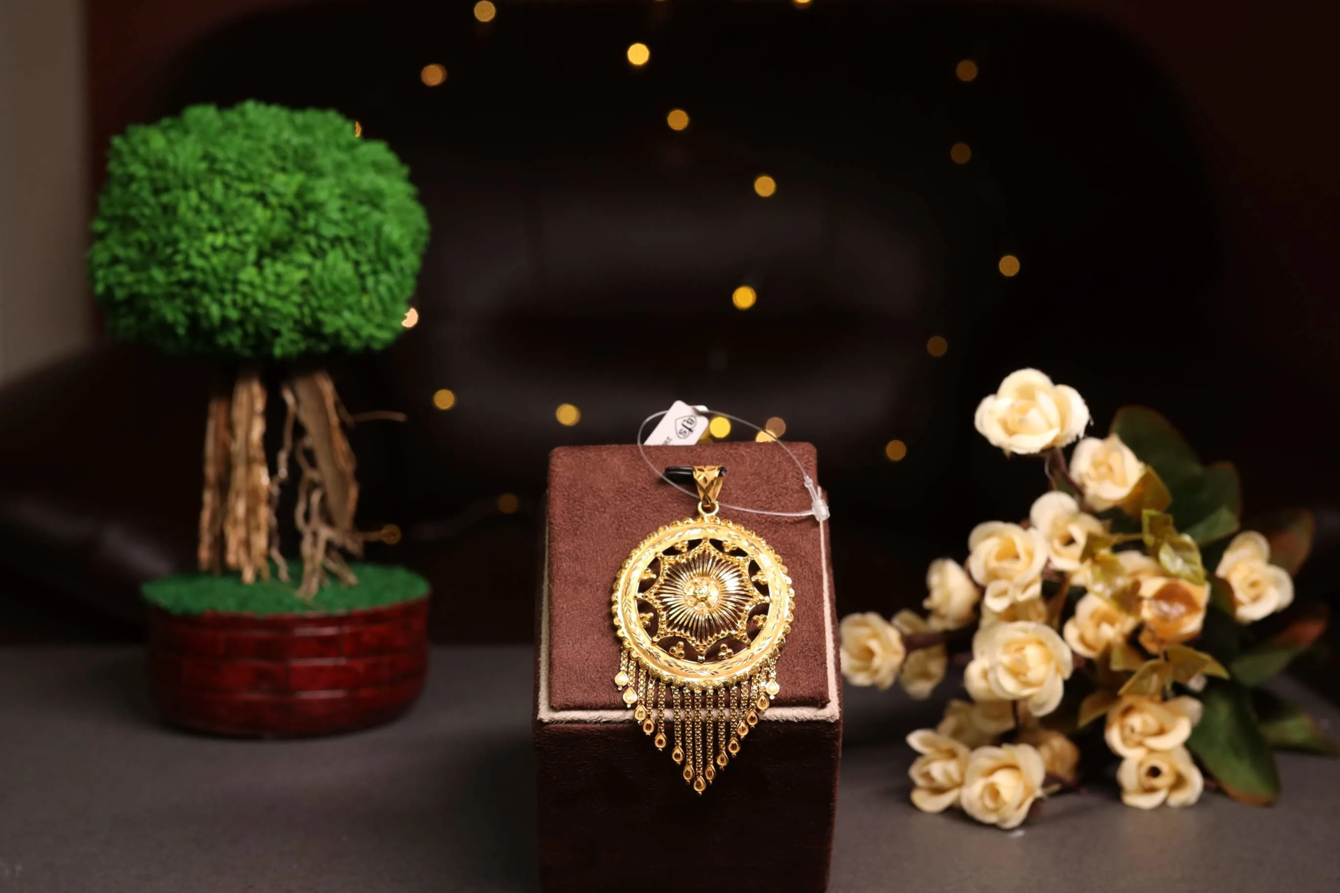 An exquisite round gold locket with sunburst detailing and layered tassel drops, radiating royal charm and timeless elegance.