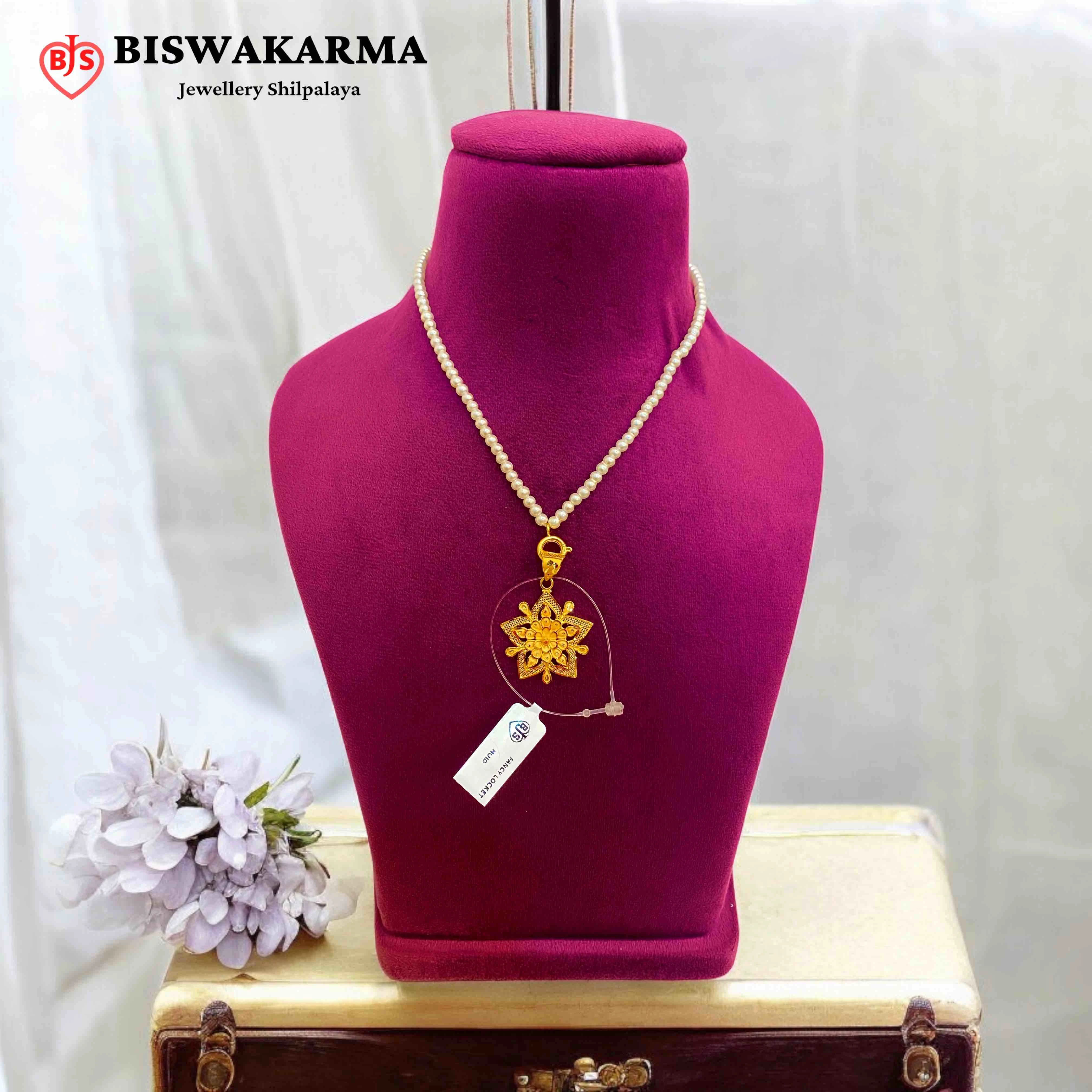 A stunning gold lotus locket paired with pearl beads, symbolizing purity and divine beauty. Perfect for festive and elegant occasions.