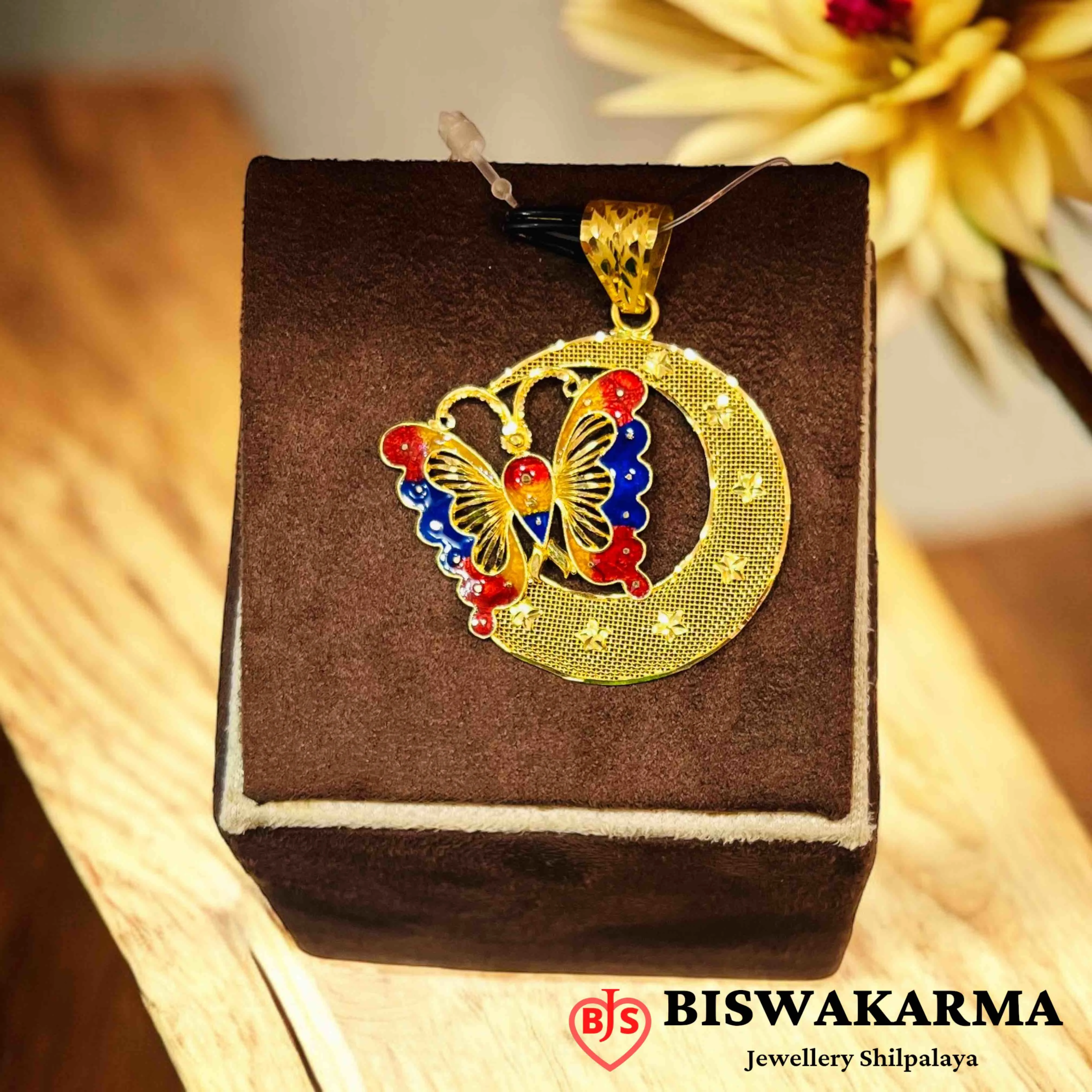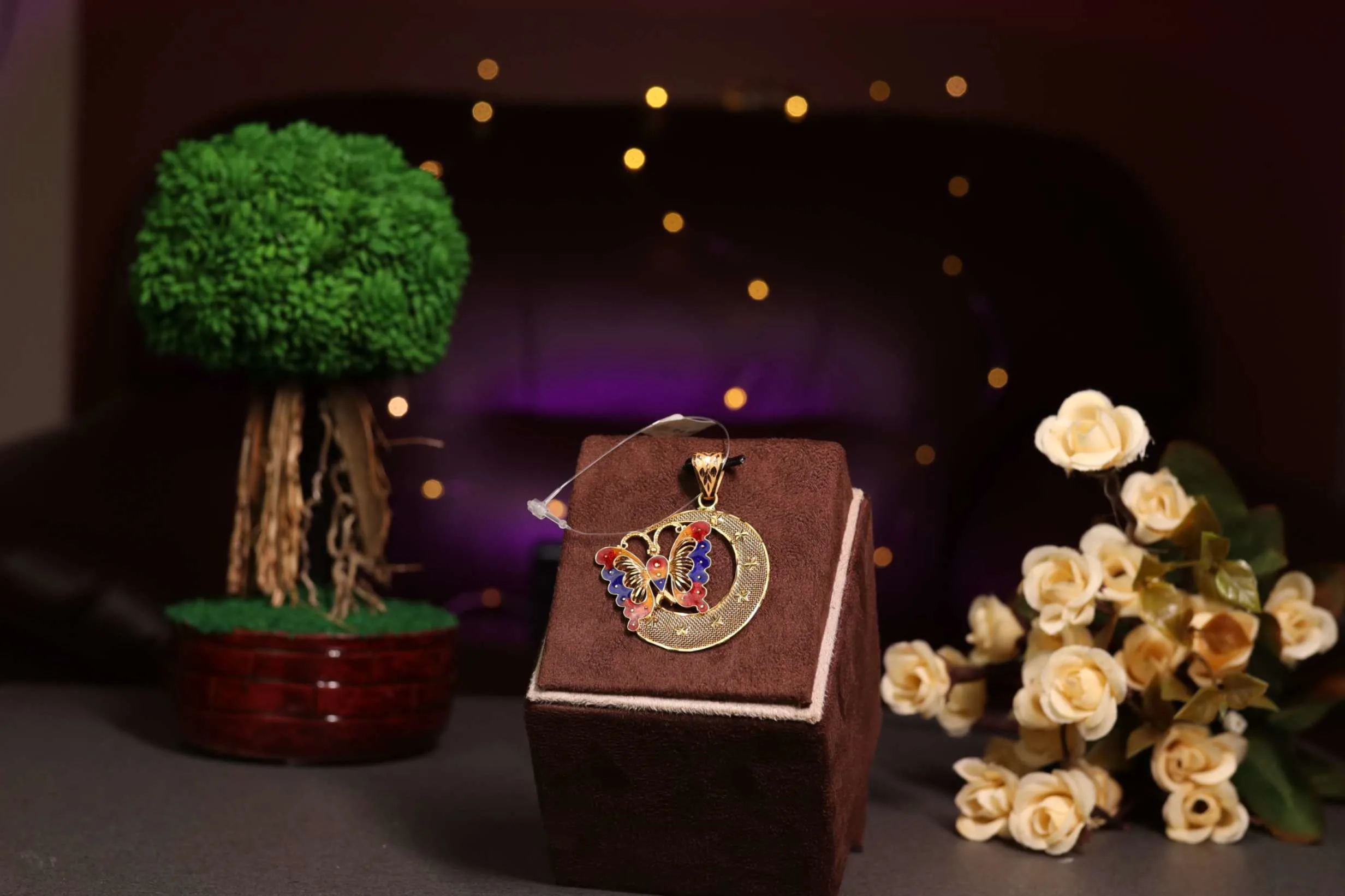 A mesmerizing gold locket featuring a butterfly on a crescent moon, adorned with colorful enamel, symbolizing beauty and new beginnings.