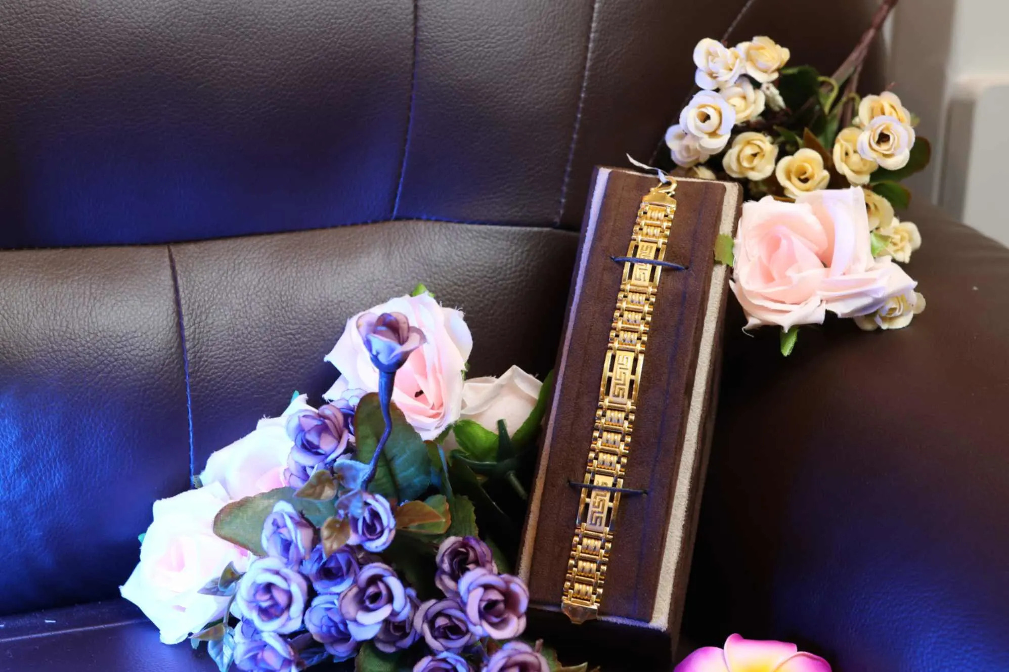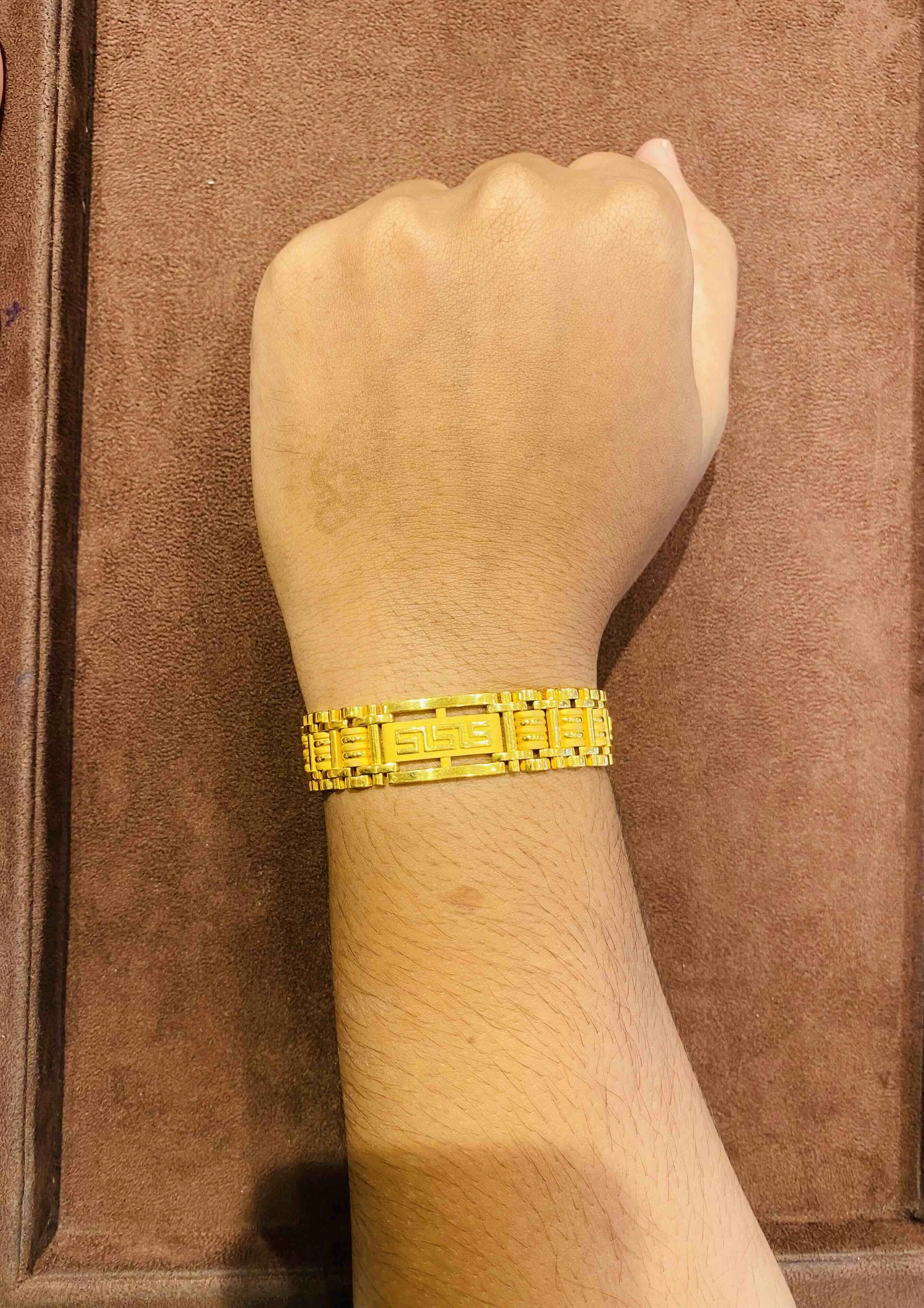 A grand gents wristlet with wide engraved gold plates, combining rich craftsmanship and royal artistry for a bold and majestic statement.