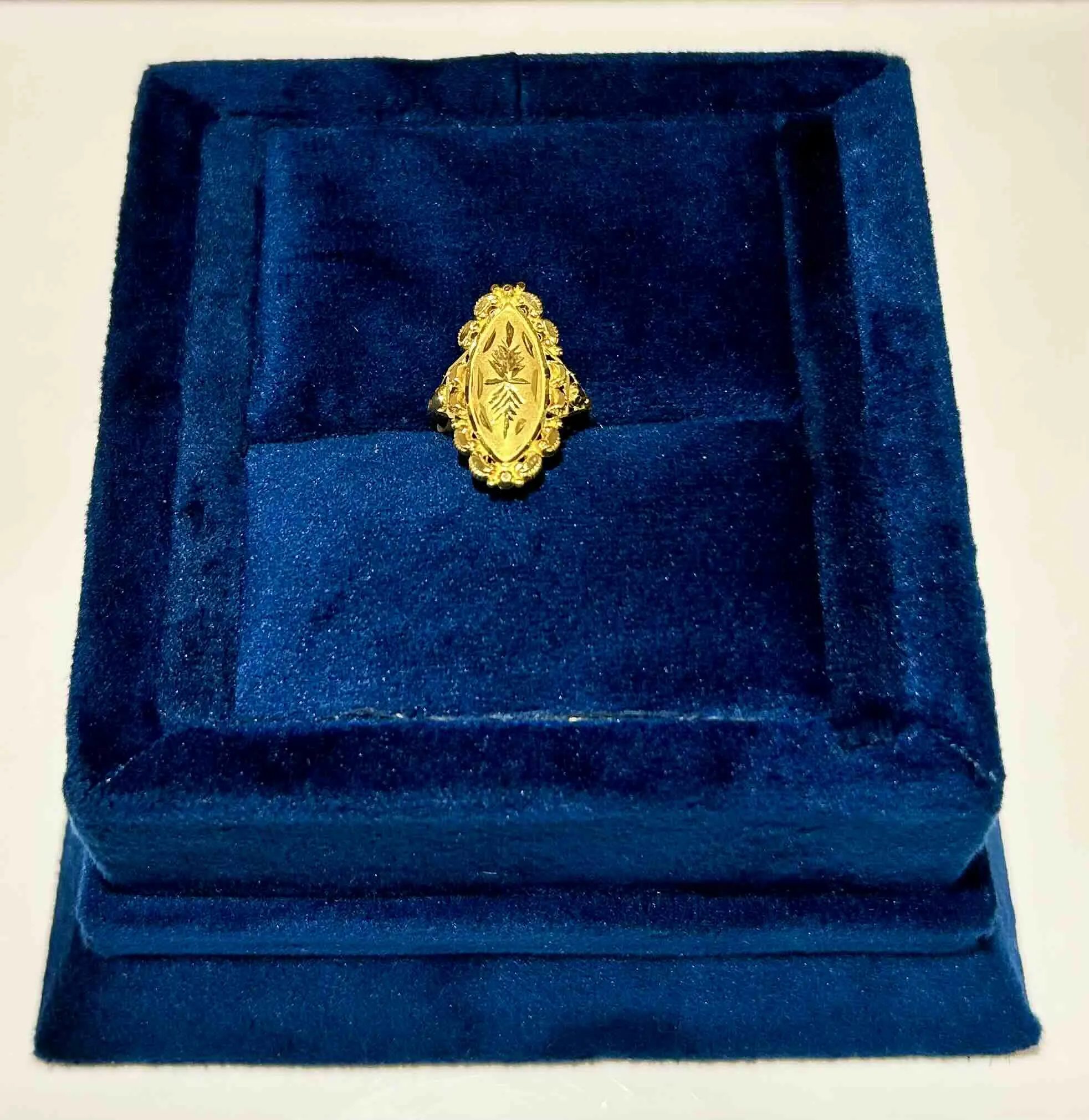 An elegant gold ring with an oval center etched in leaf patterns and framed with fine curves. It radiates timeless beauty and refined grace.