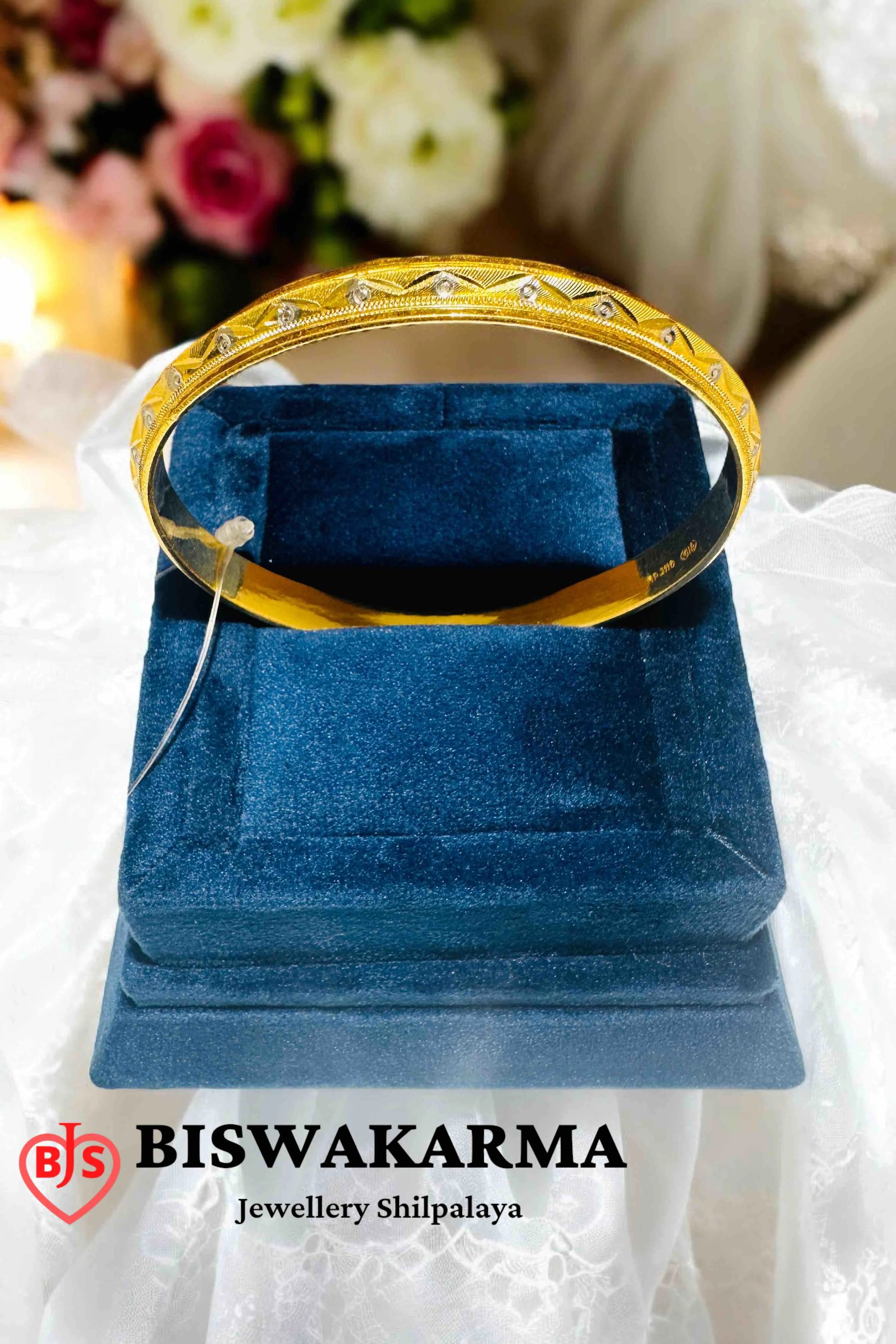 A classic gold kada with fine petal engravings and a glossy finish, blending elegance with strength for timeless Punjabi style.
