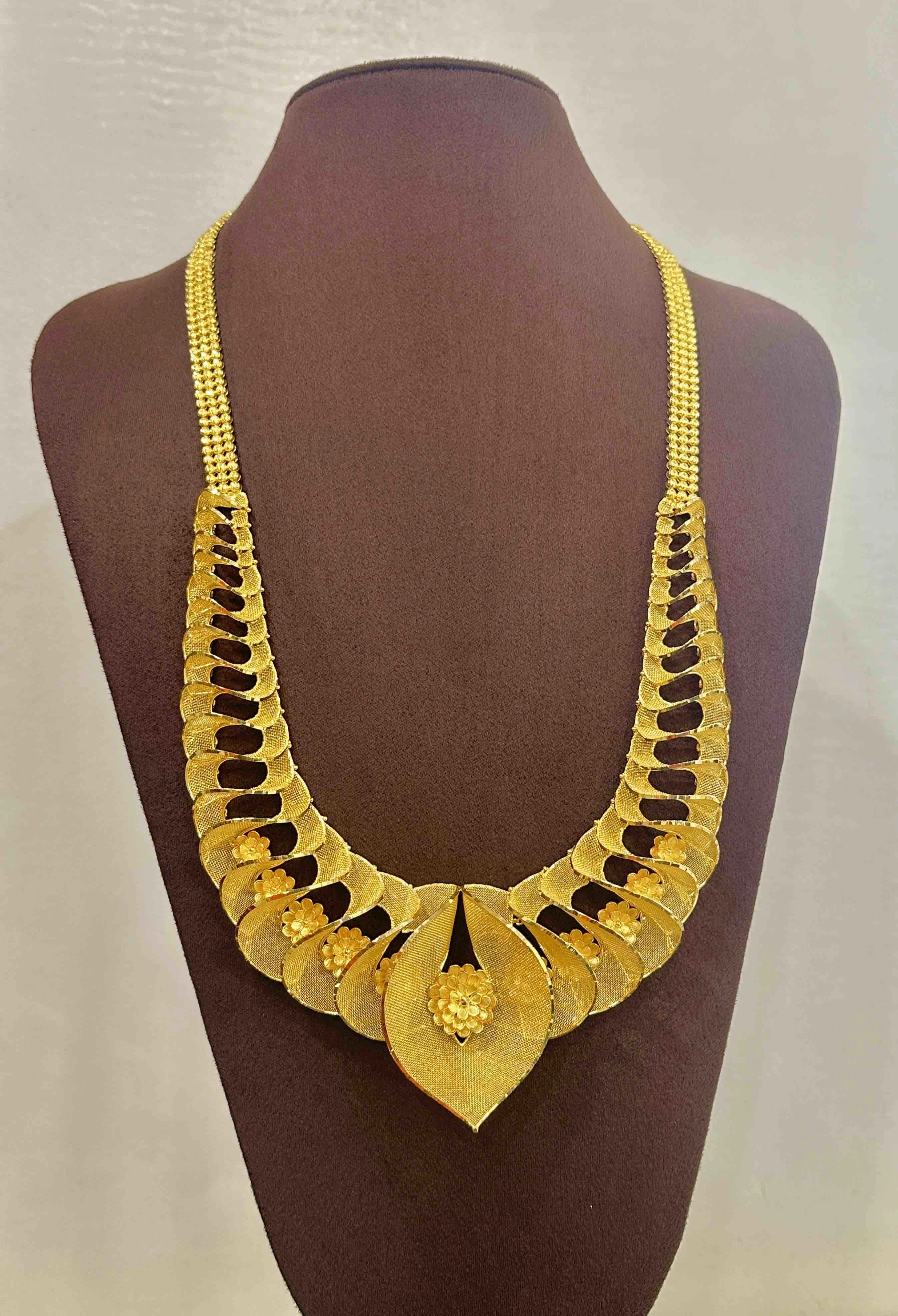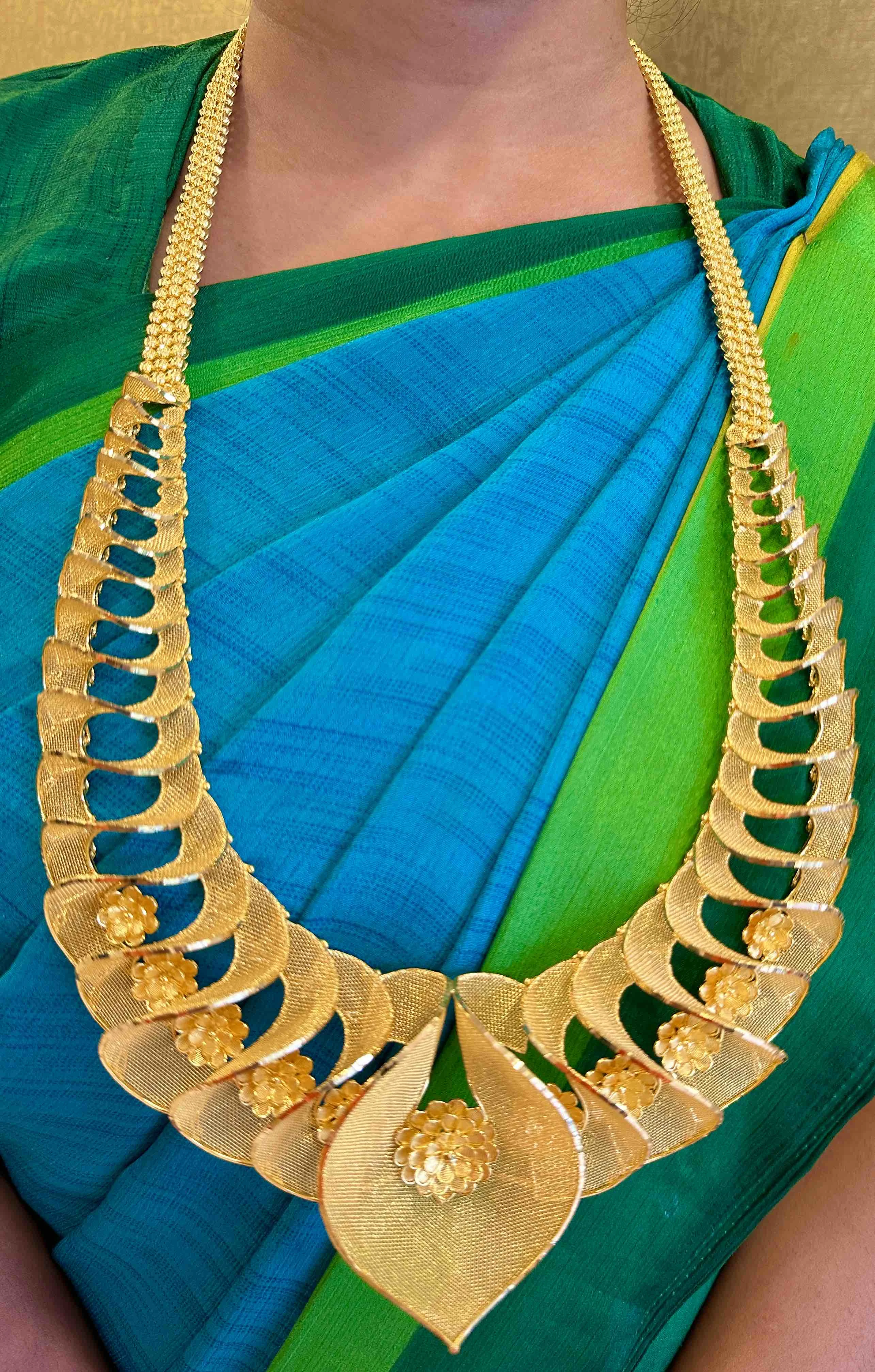 A majestic gold haar with sculpted leaf motifs and a bold central bloom, radiating regal artistry and the opulence of handcrafted tradition.