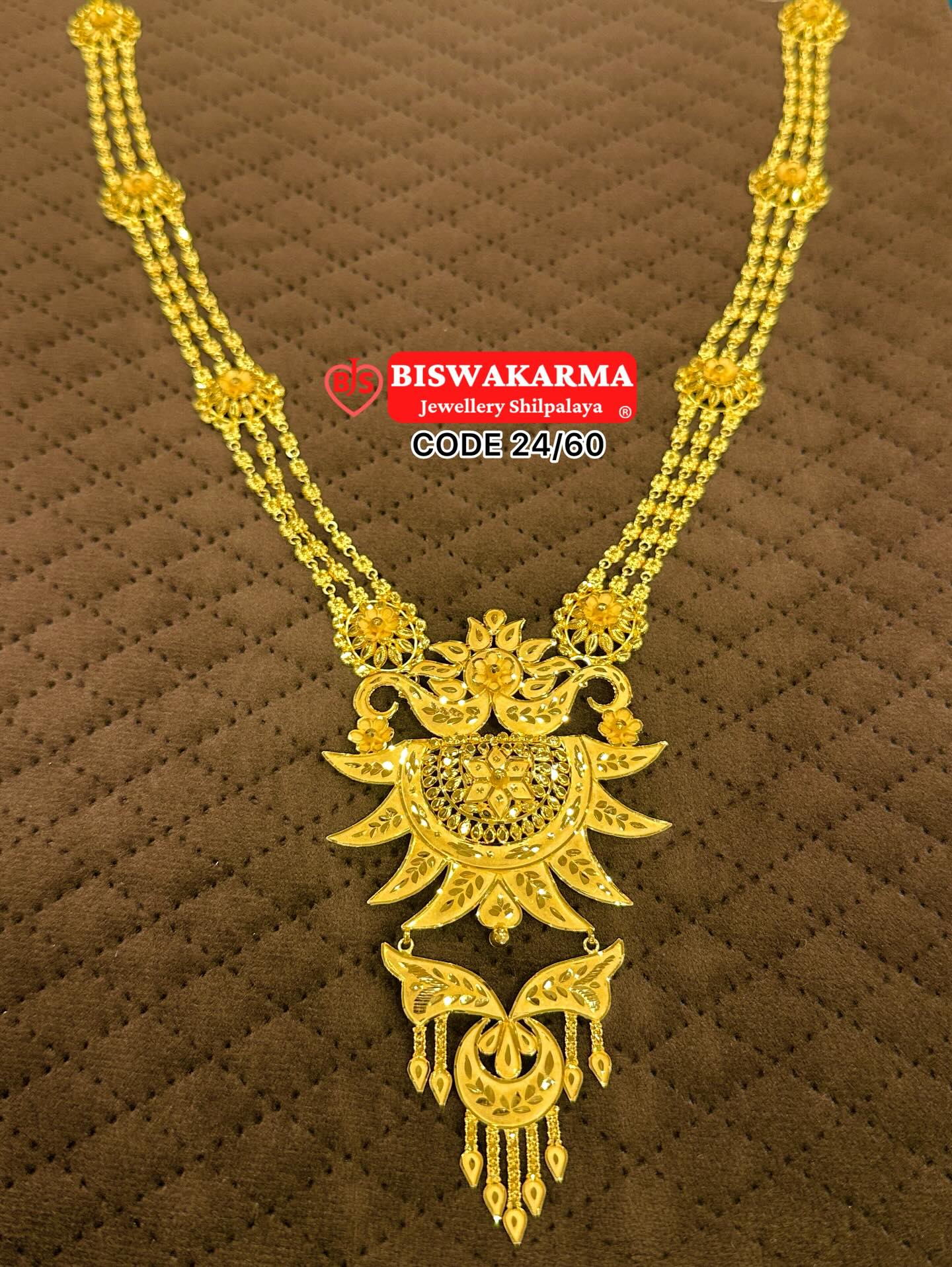 A majestic gold haar adorned with an intricate lotus-inspired pendant and dual-chain design, radiating divine elegance and traditional grandeur.