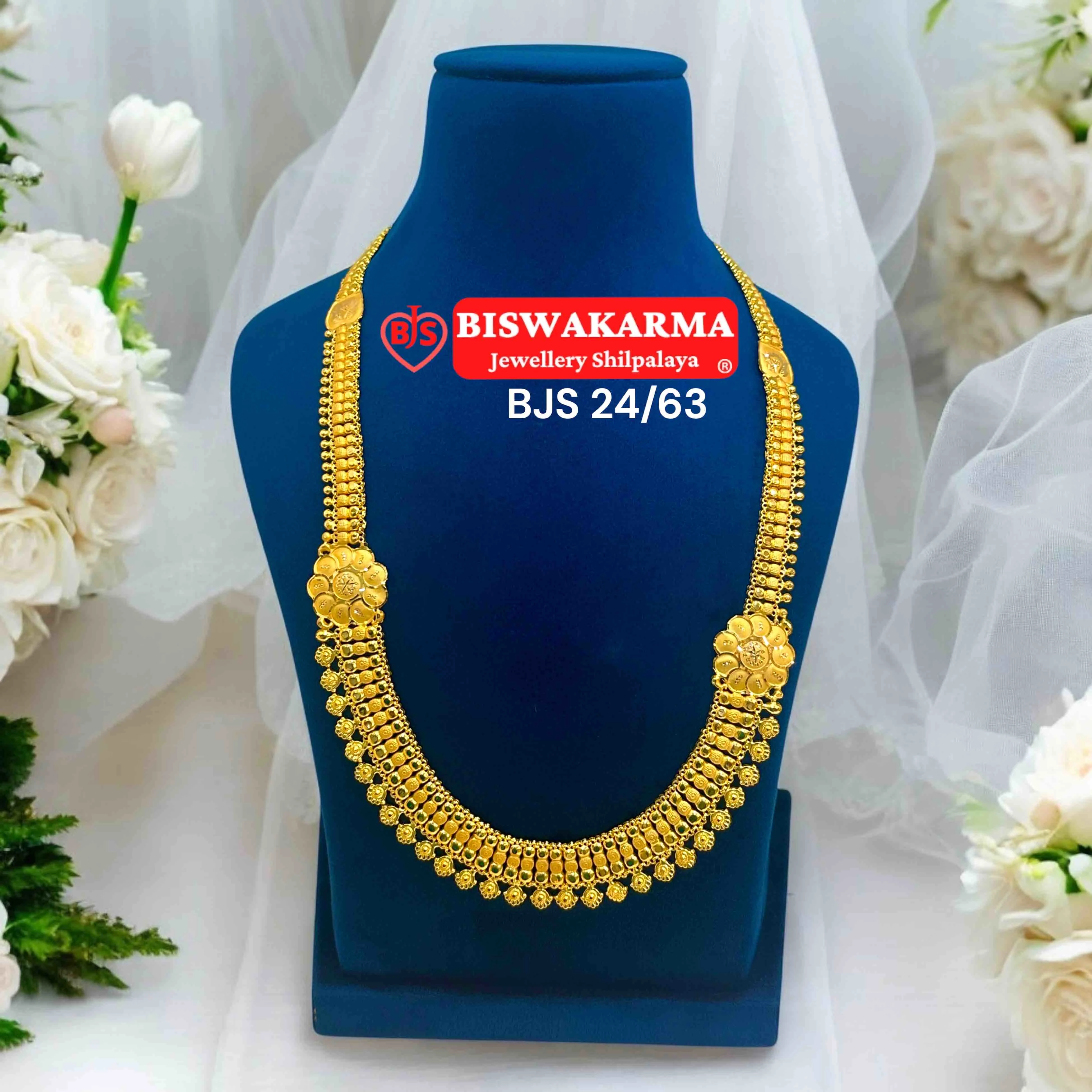 A majestic gold haar adorned with intricate floral ends and tiered beadwork, capturing the essence of royal tradition and temple artistry.