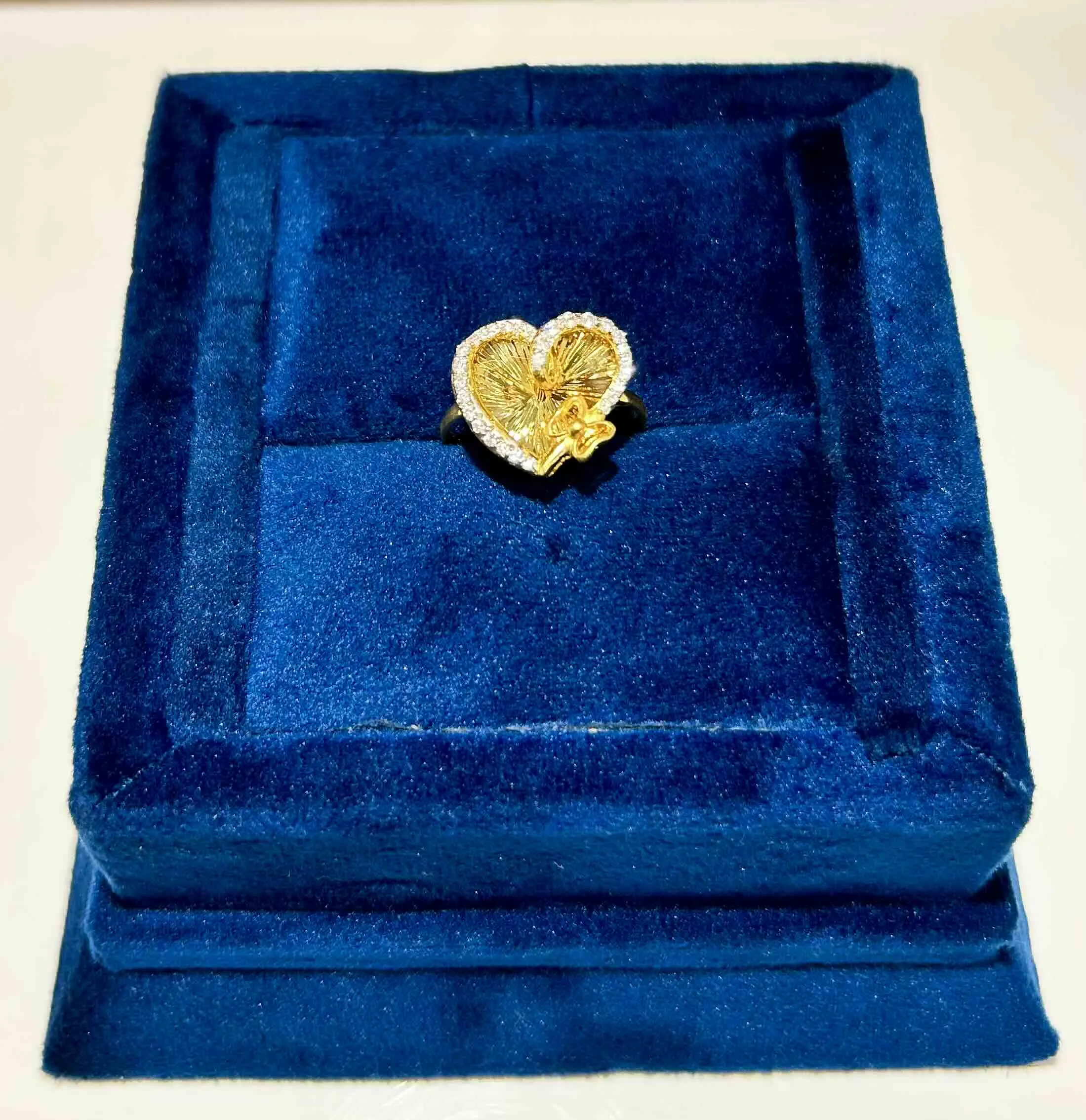 A pretty gold ring featuring two joined hearts with a shimmering texture. Its sweet and elegant design celebrates love and togetherness.