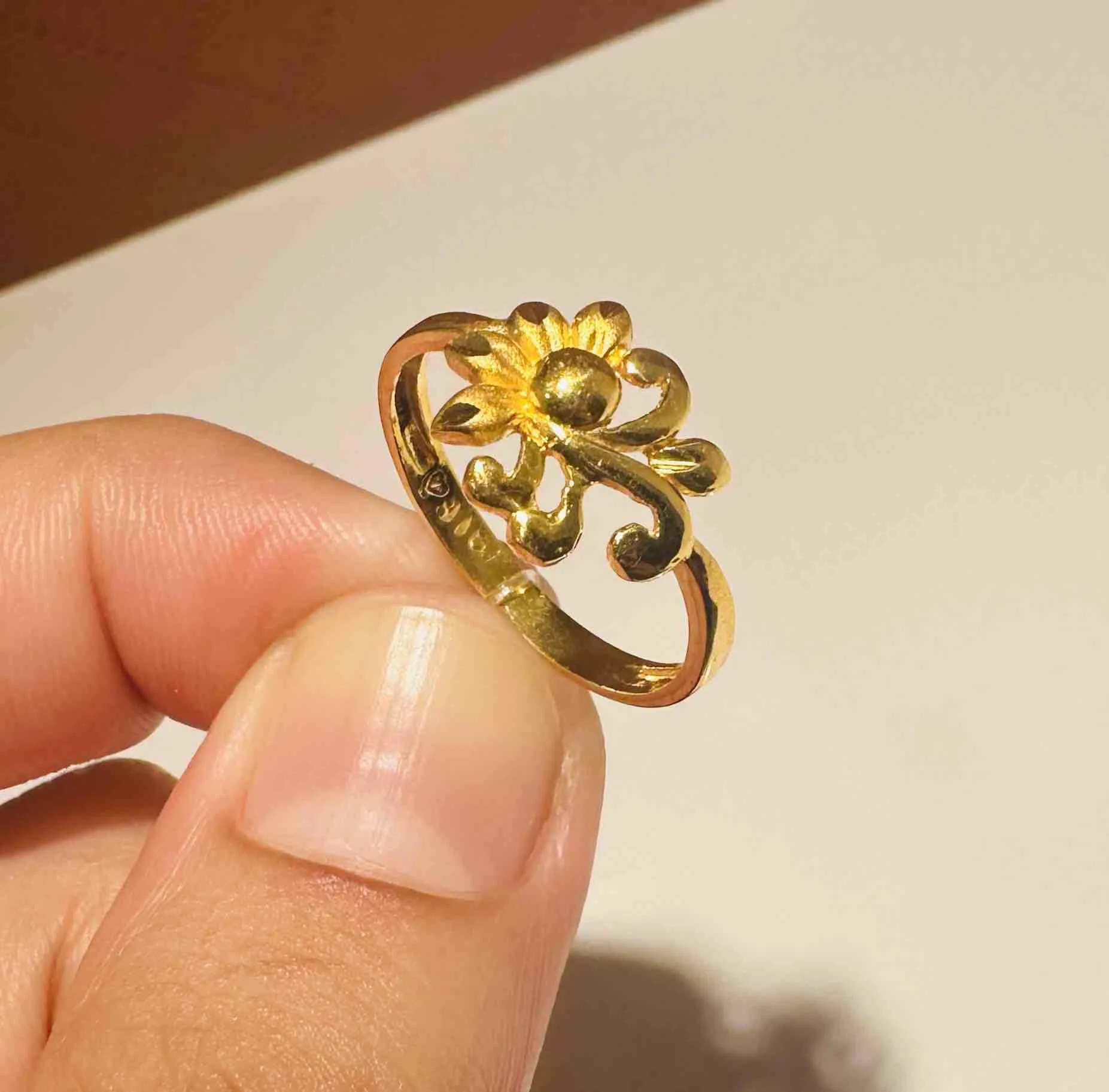 A radiant gold ring with a delicate flower and swirling vine design, symbolizing joy and natural beauty in a graceful handcrafted form.