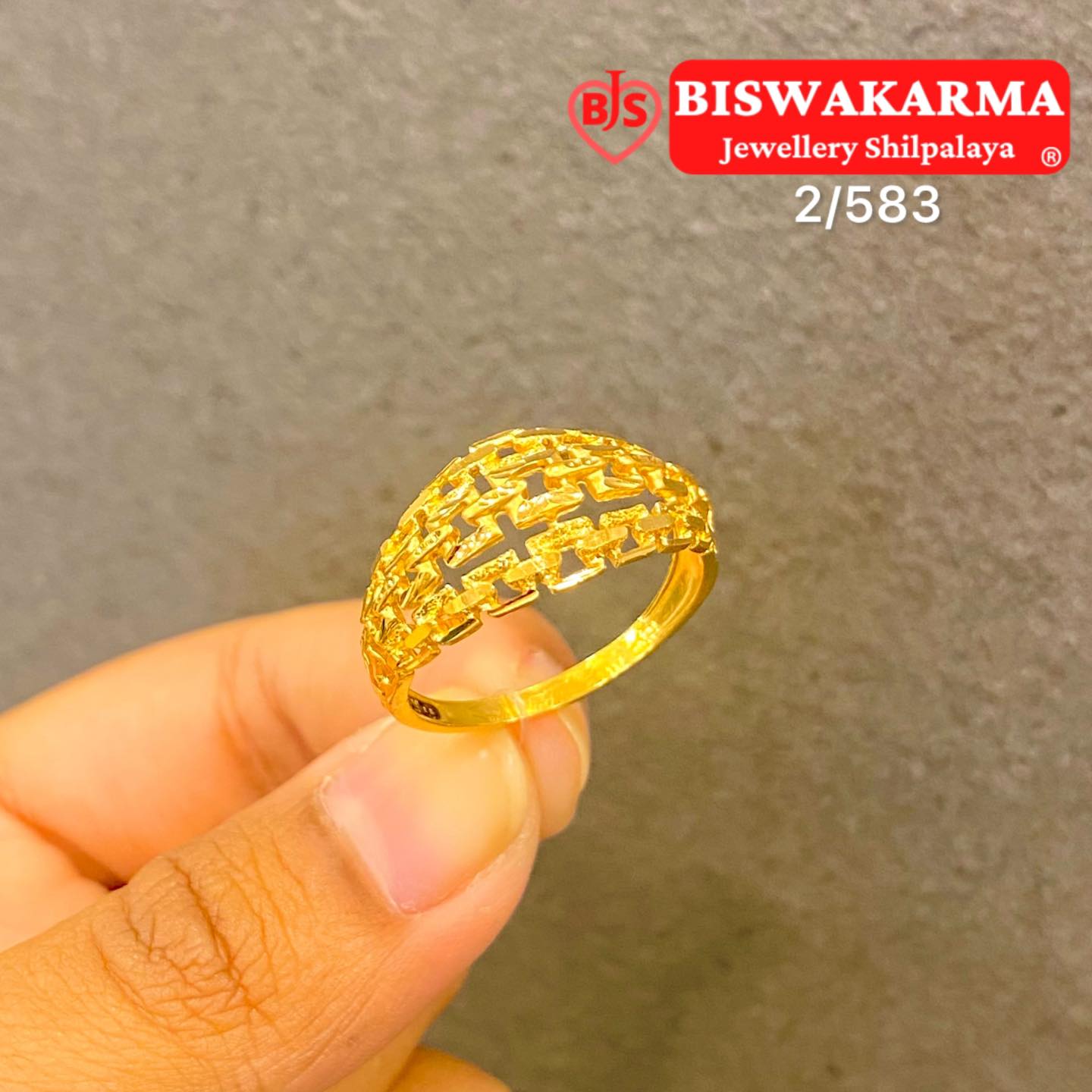 A bold golden ring with a rich mesh pattern that shines with elegance. Its detailed design adds a royal charm to any outfit.