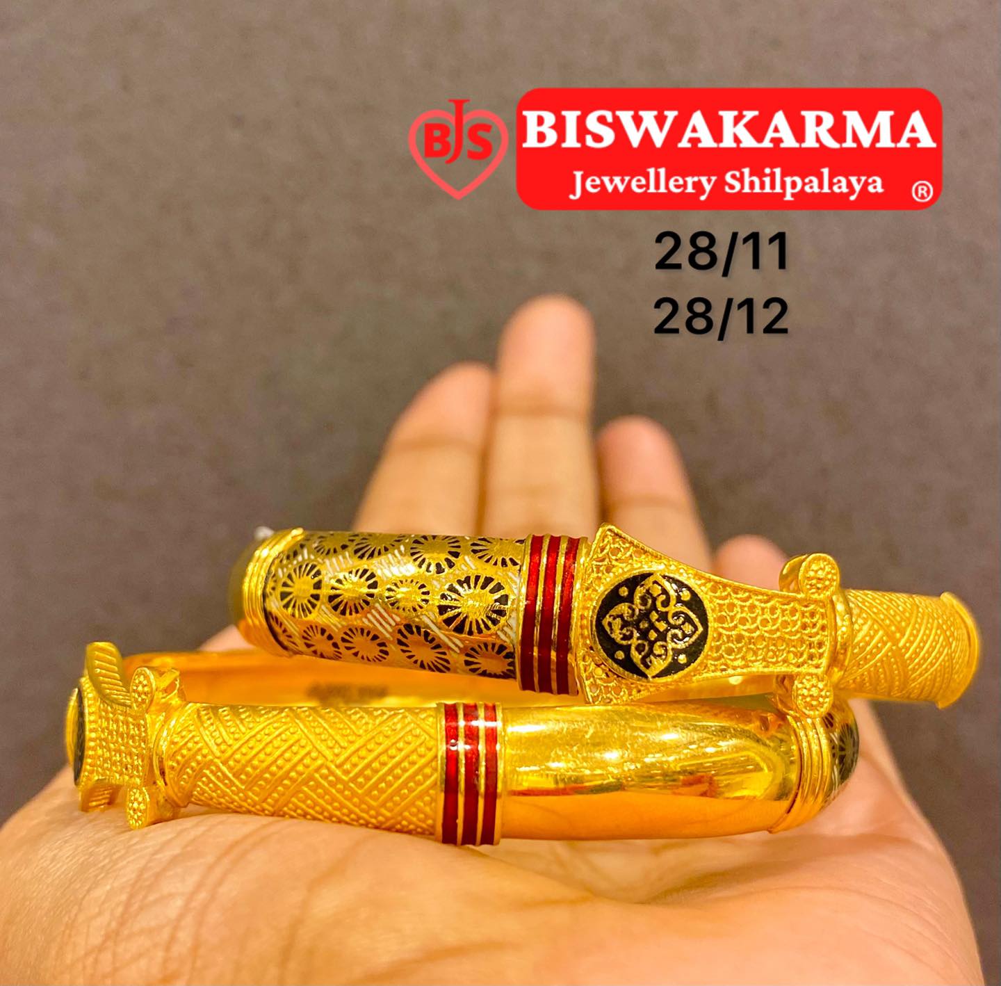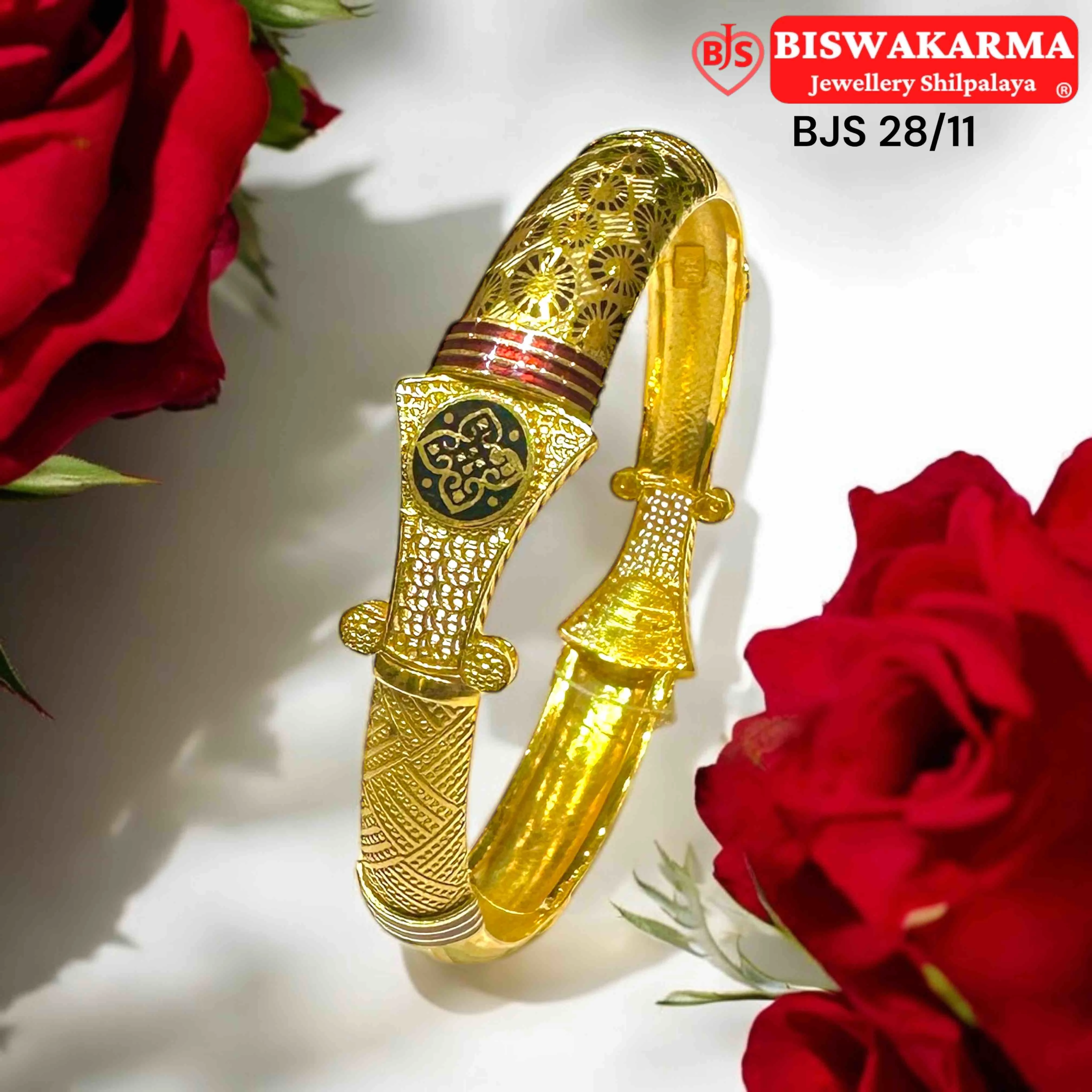 A unique gold solid churi with dagger-inspired detailing and enamel accents, showcasing bold artistry and royal traditional flair.
