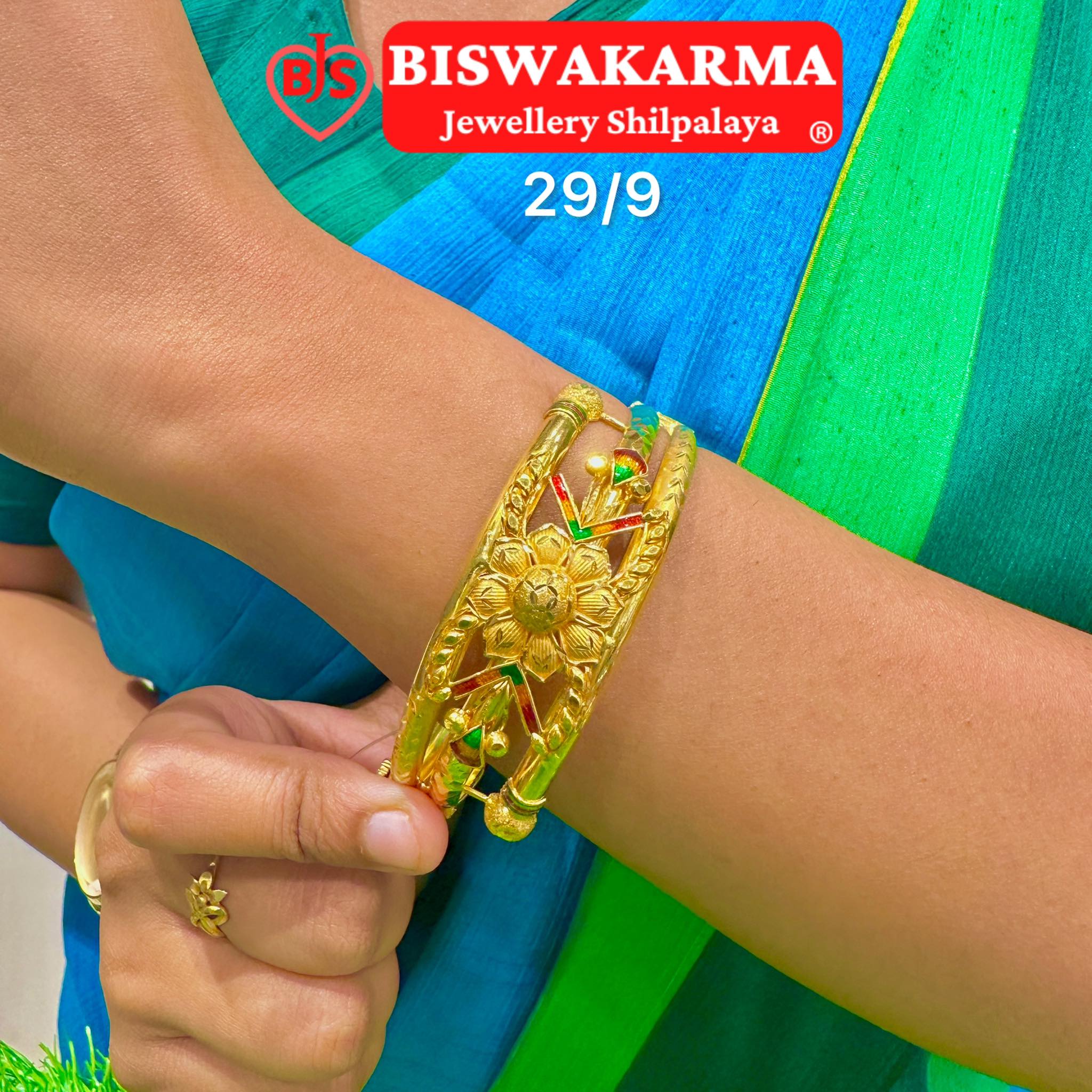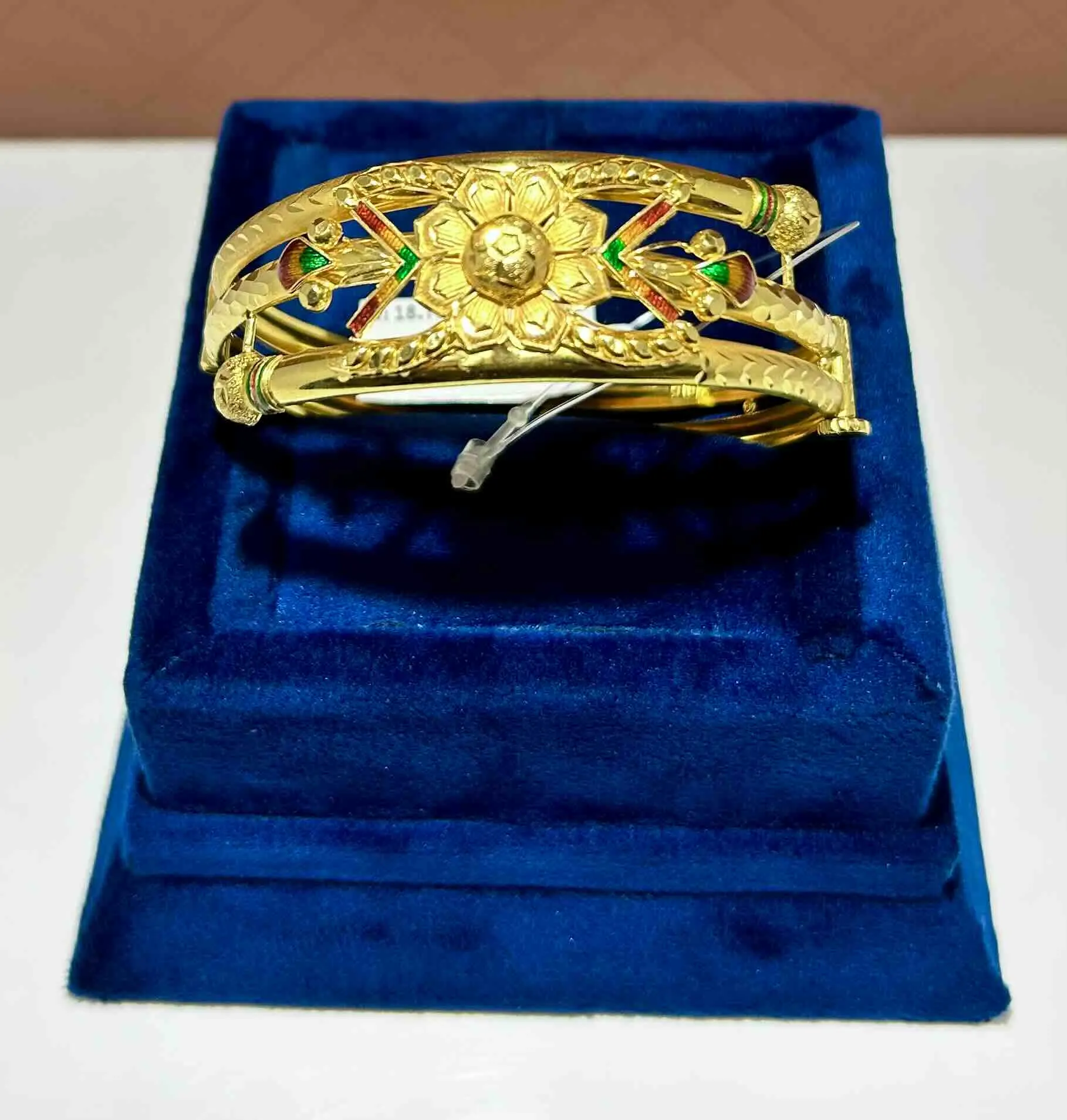 A graceful gold kabza bracelet adorned with colorful enamel and floral carvings, combining timeless tradition with a touch of modern artistry.