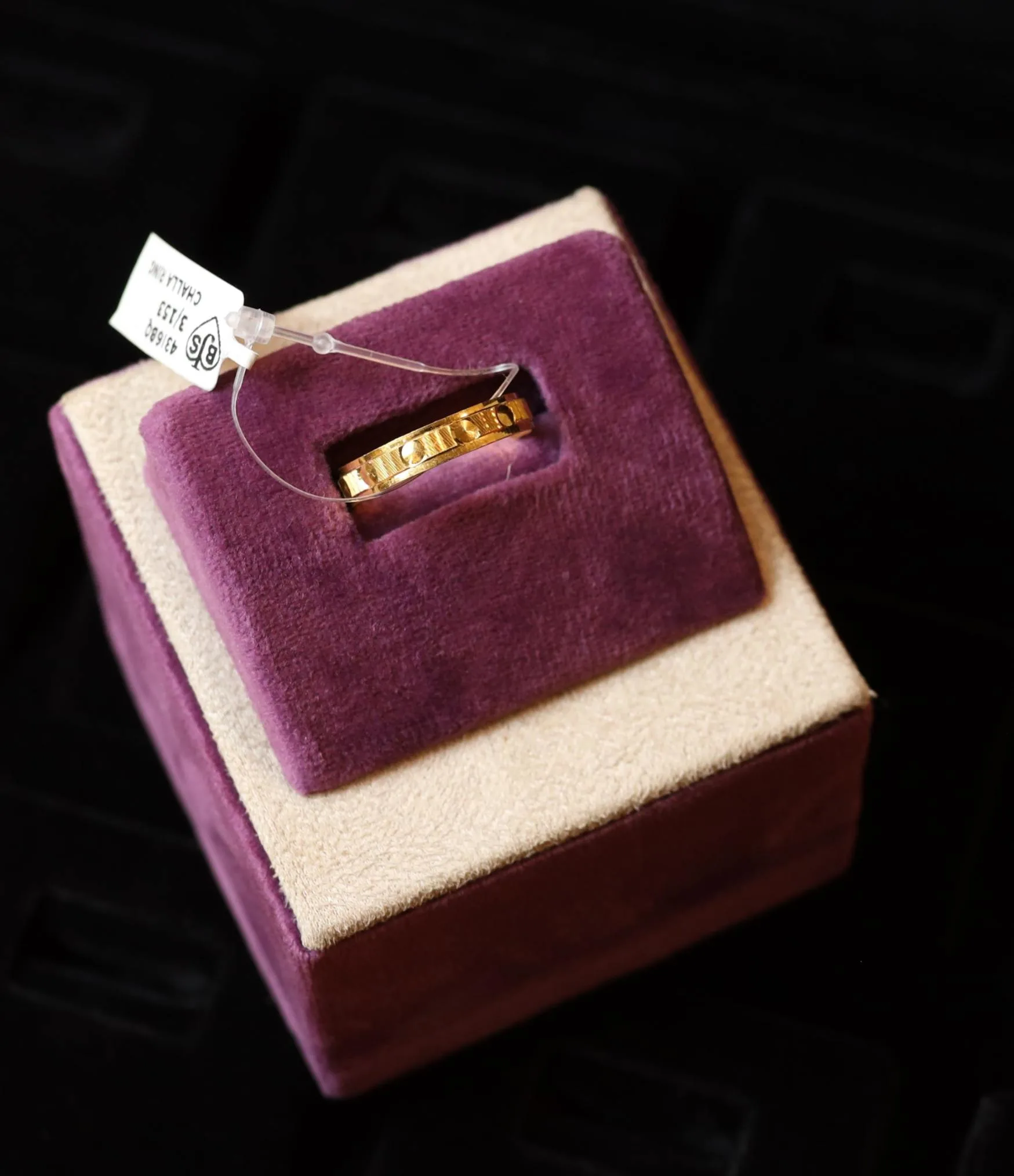A bold gold thumb ring with deep-cut linear and dot engravings that play with light, giving a rich textured shine and a confident handcrafted appeal.