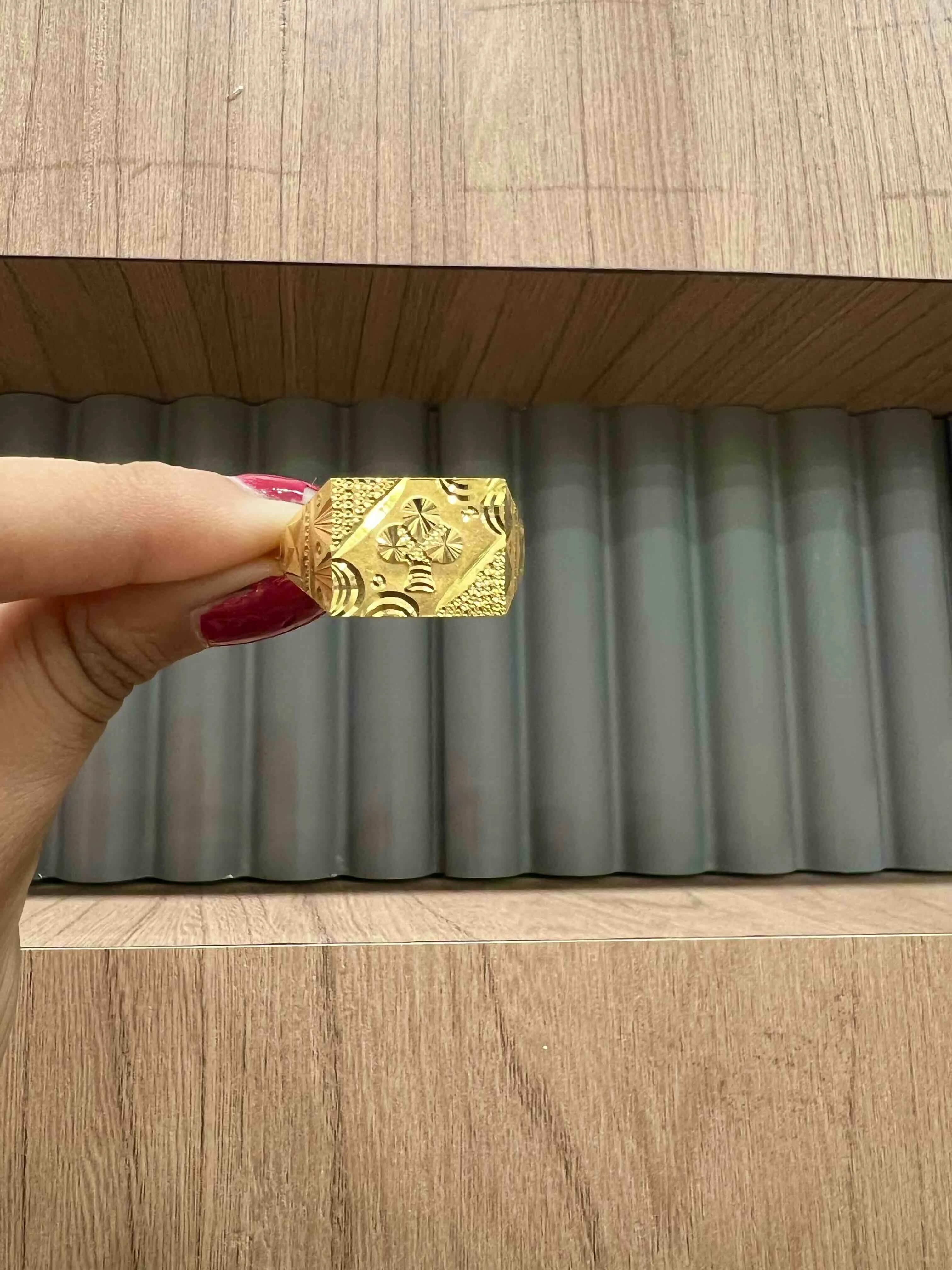 A refined gold ring featuring geometric engraving and floral motifs, blending tradition with modern artistry for a bold, elegant masculine appeal.