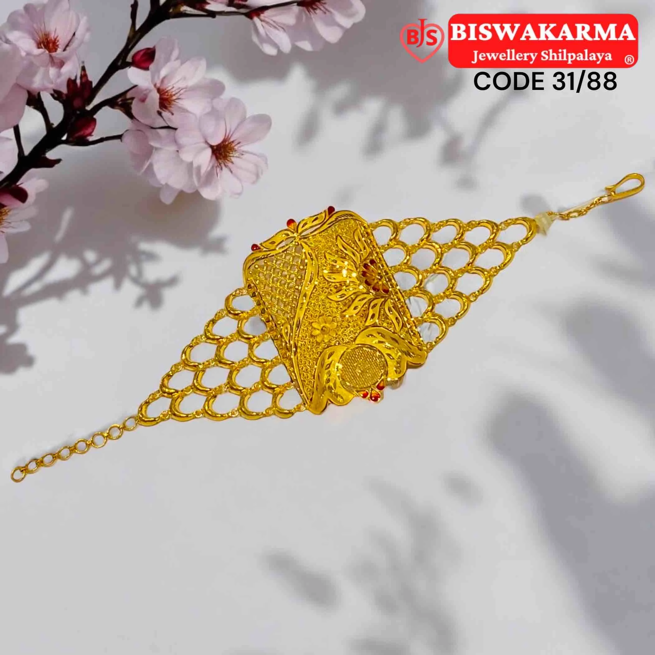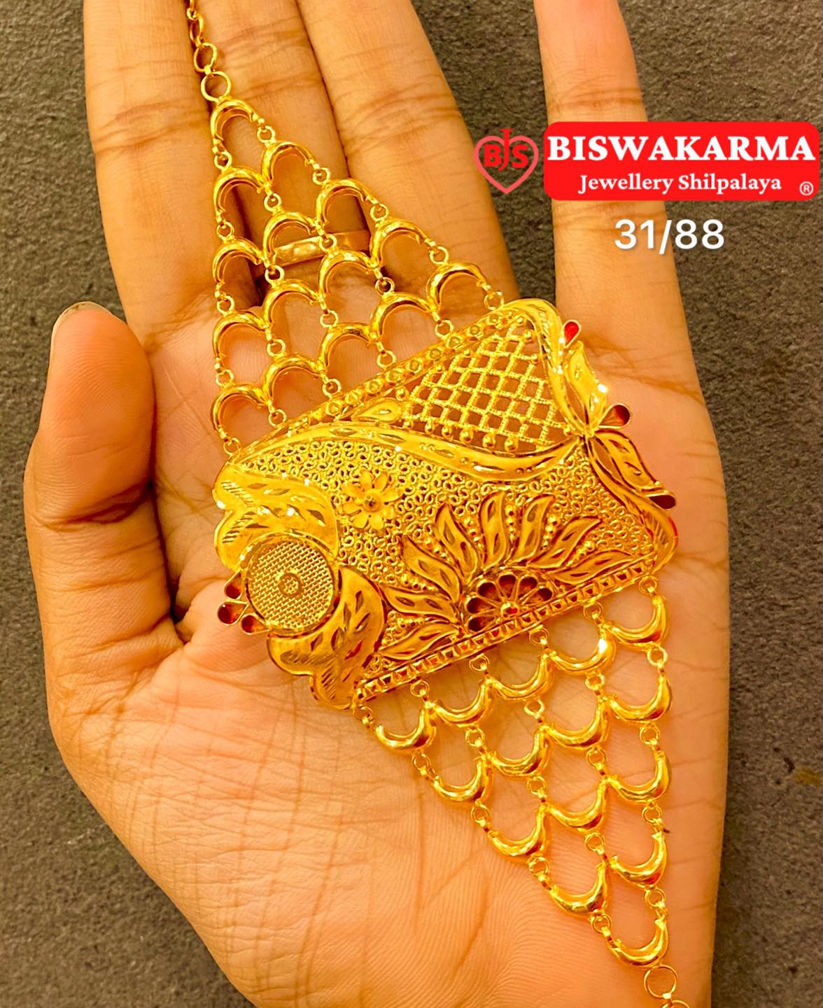 A regal gold mantasha with lattice mesh sides and intricate central filigree, blending bold craftsmanship with elegant floral artistry for a royal touch.