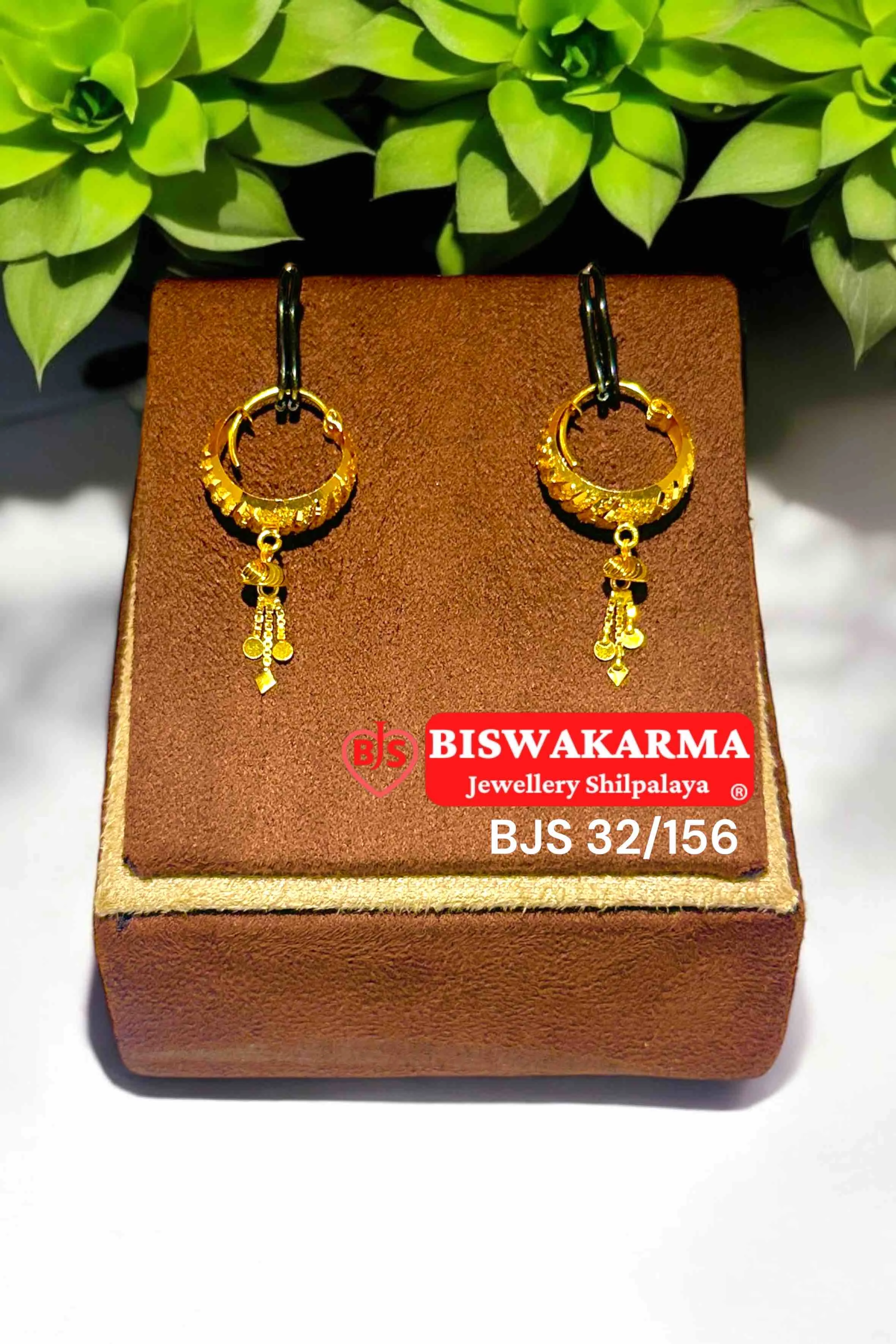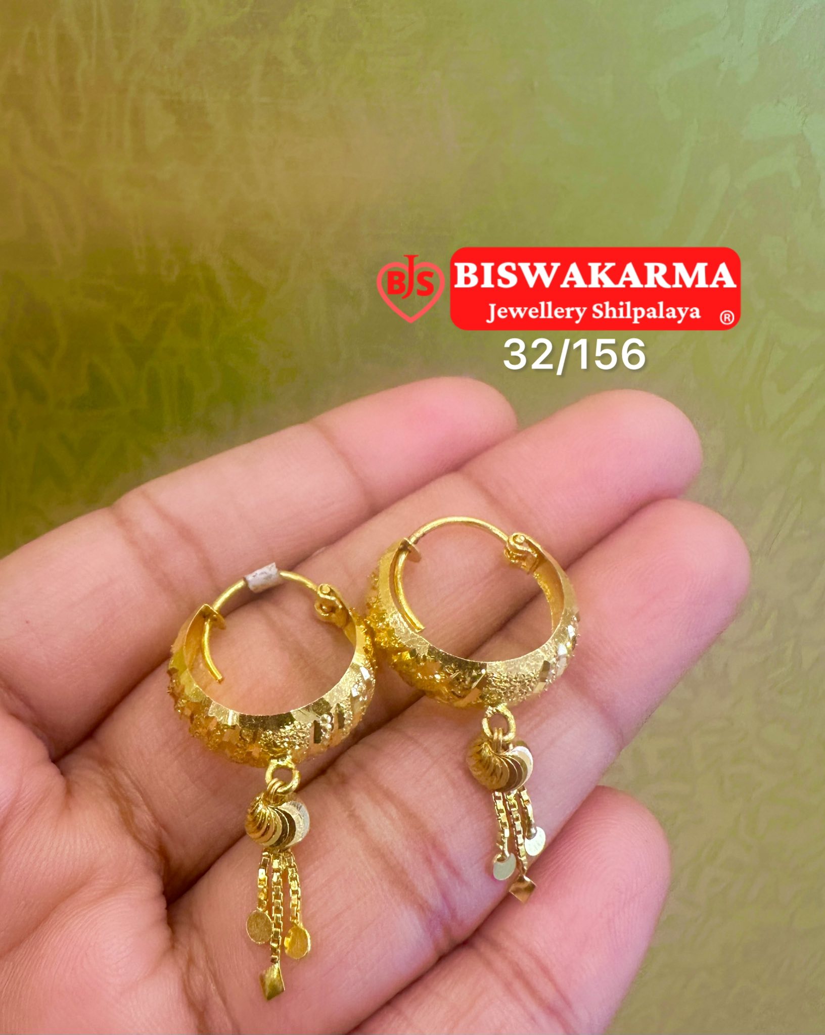 Elegant gold bali earrings with carved hoops and tiny hanging drops, adding a graceful shimmer and traditional charm to your festive look.
