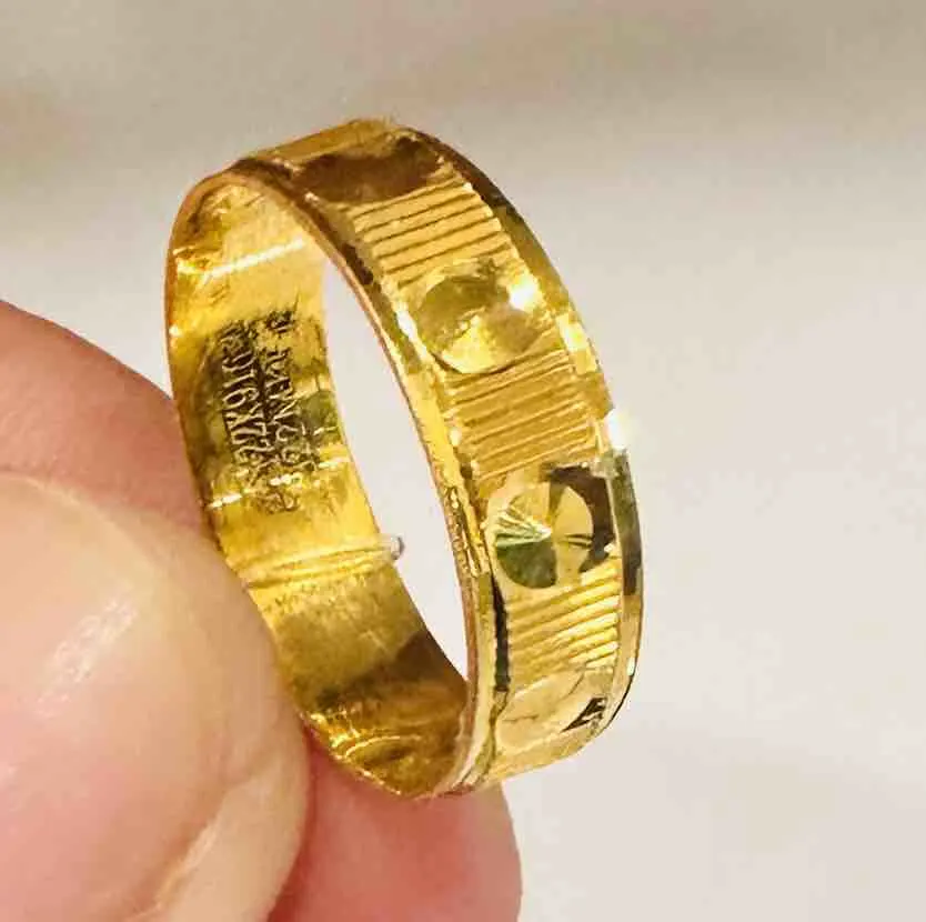 This gold thumb ring features a dual-textured surface with circular grooves and fine line etching, adding depth and a timeless handcrafted appeal.