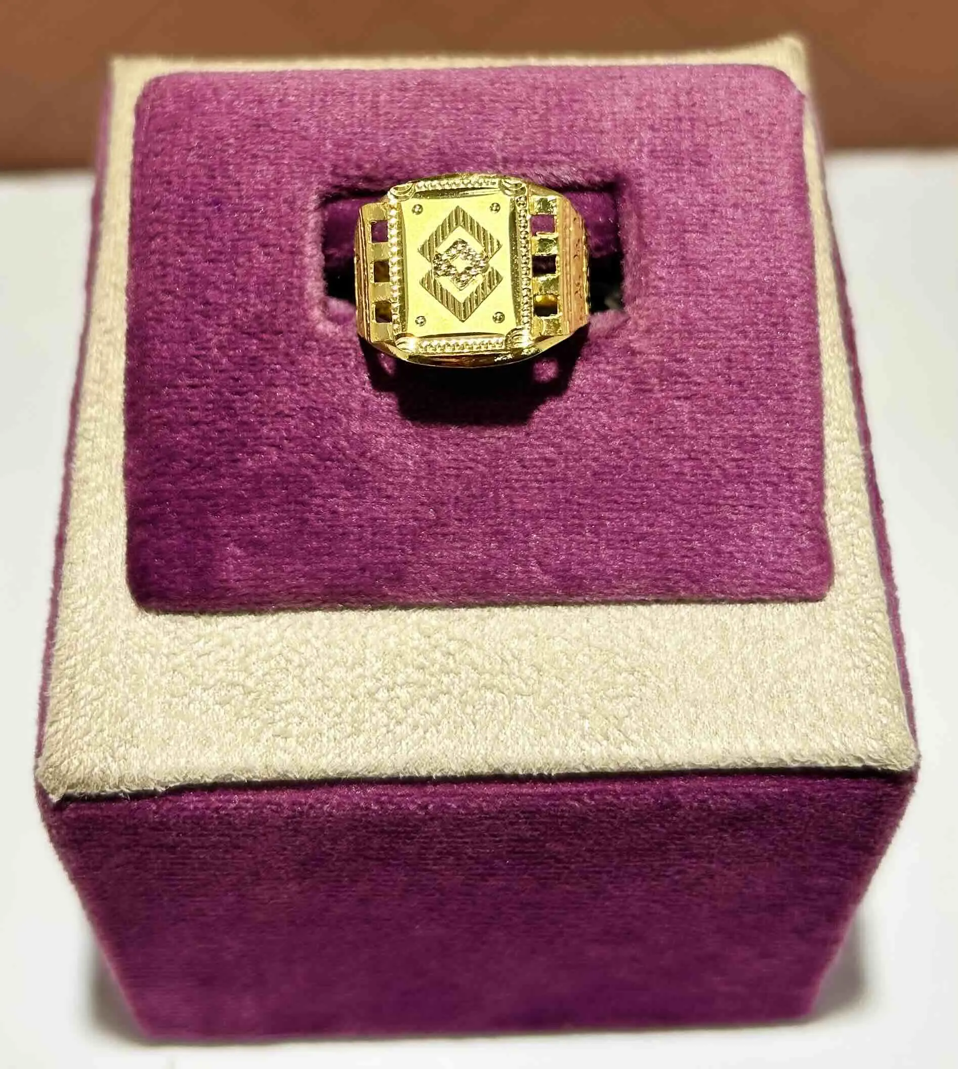 A luxurious gold ring with geometric engravings and gemstone inlays, exuding royal elegance and impeccable masculine sophistication.