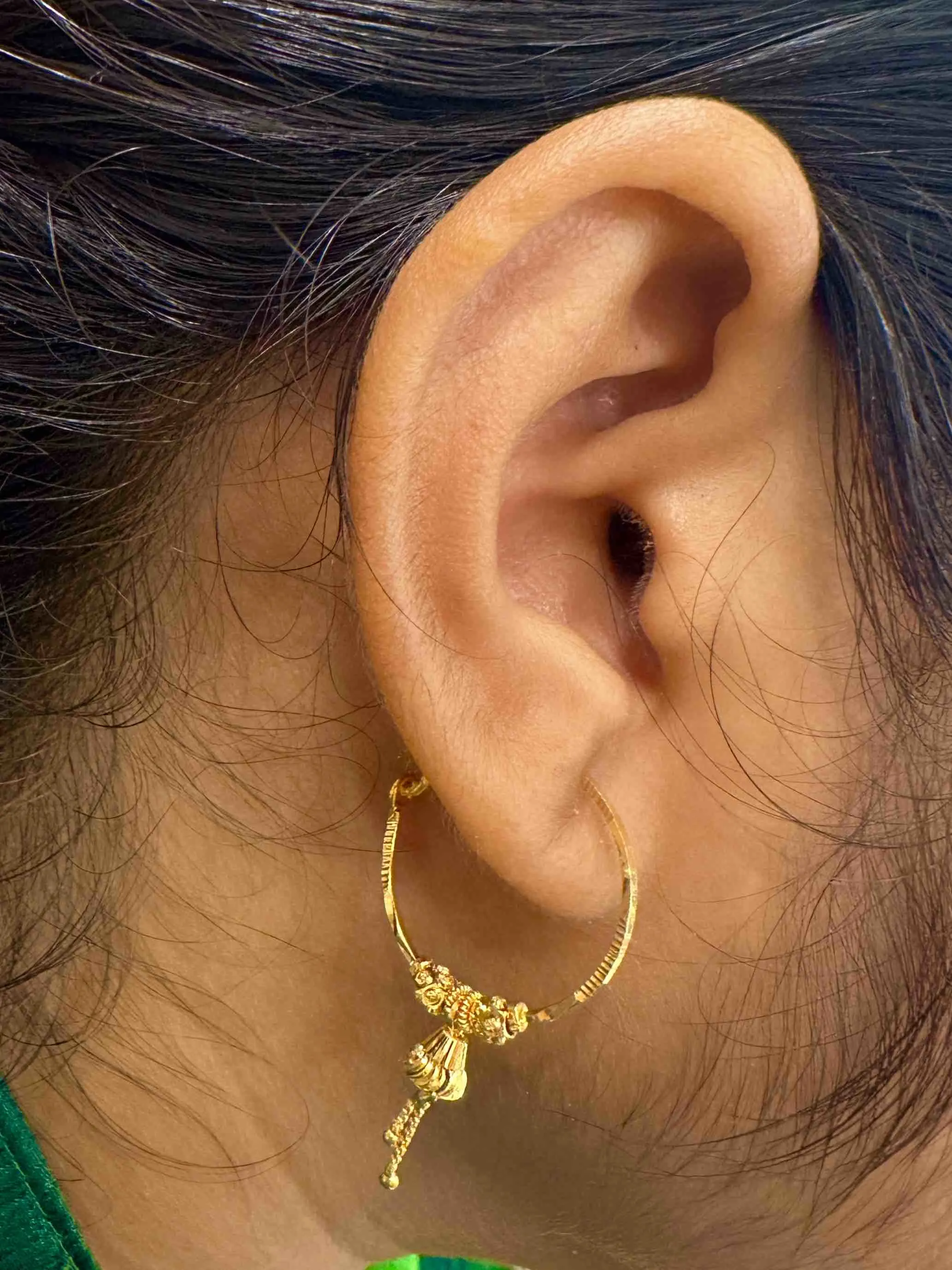 Elegant gold bali earrings with fine textured hoops and a hanging drop charm, blending tradition with refined everyday elegance.