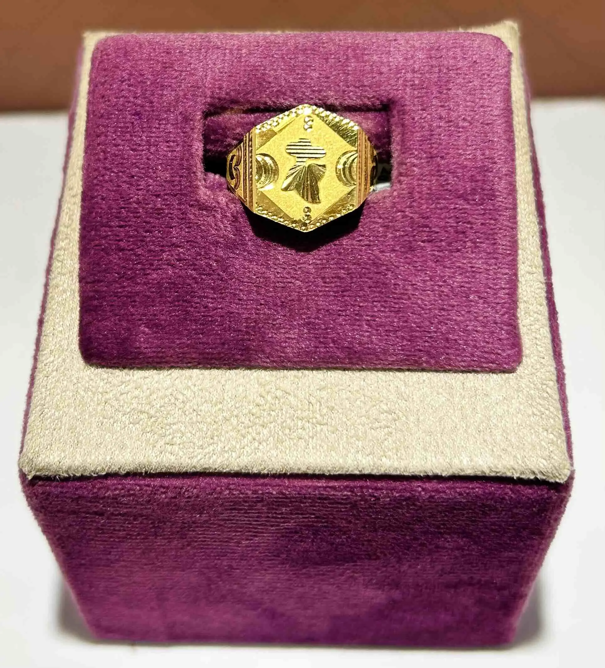 A finely crafted gold ring with a hexagonal face and artistic carvings, blending bold geometry with refined traditional craftsmanship.