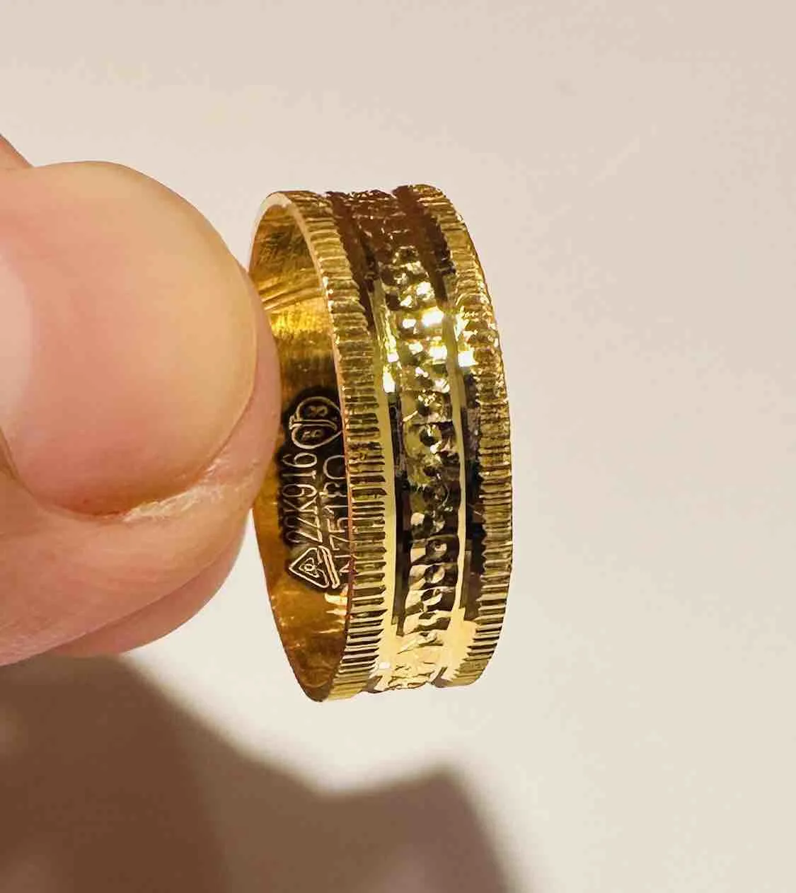 A broad gold thumb ring with hammered and ridged detailing, blending bold shine and texture for a timeless, handcrafted appeal.